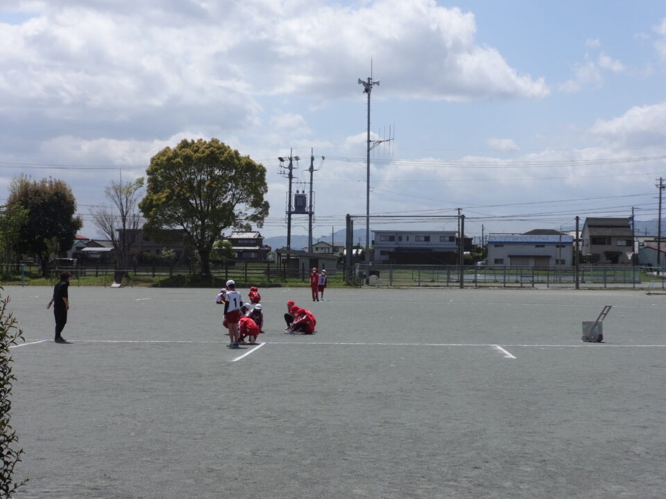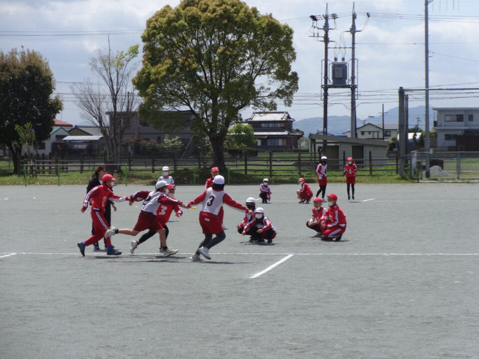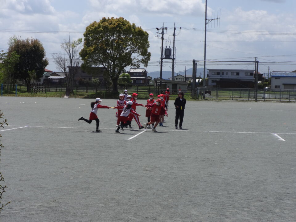 テイクオーバーゾーンをうまく使えるように、スピードを落とさず、バトンパスができるように、取り組んでいました。先生の「走りながら、バトンをもらうよ。」「インコースを走るよ。」の声かけで、回を重ねるごとにチームの力が伸びていきました。