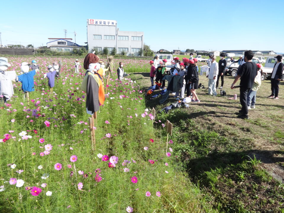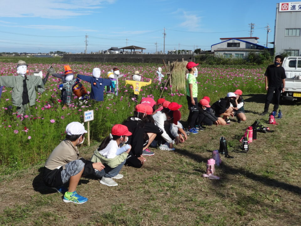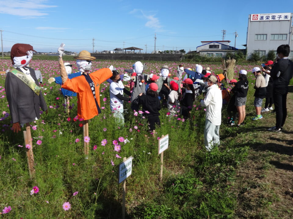 自分たちが作ったかかしを協力して立てました。そのかかしを見て嬉しそうにしていました。人がいるように見せた、子どもたちが作ったかかしの効果で、きれいに咲いたコスモスの環境が長くつづくことを願っています。