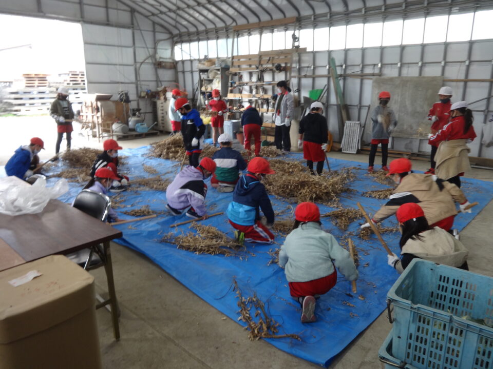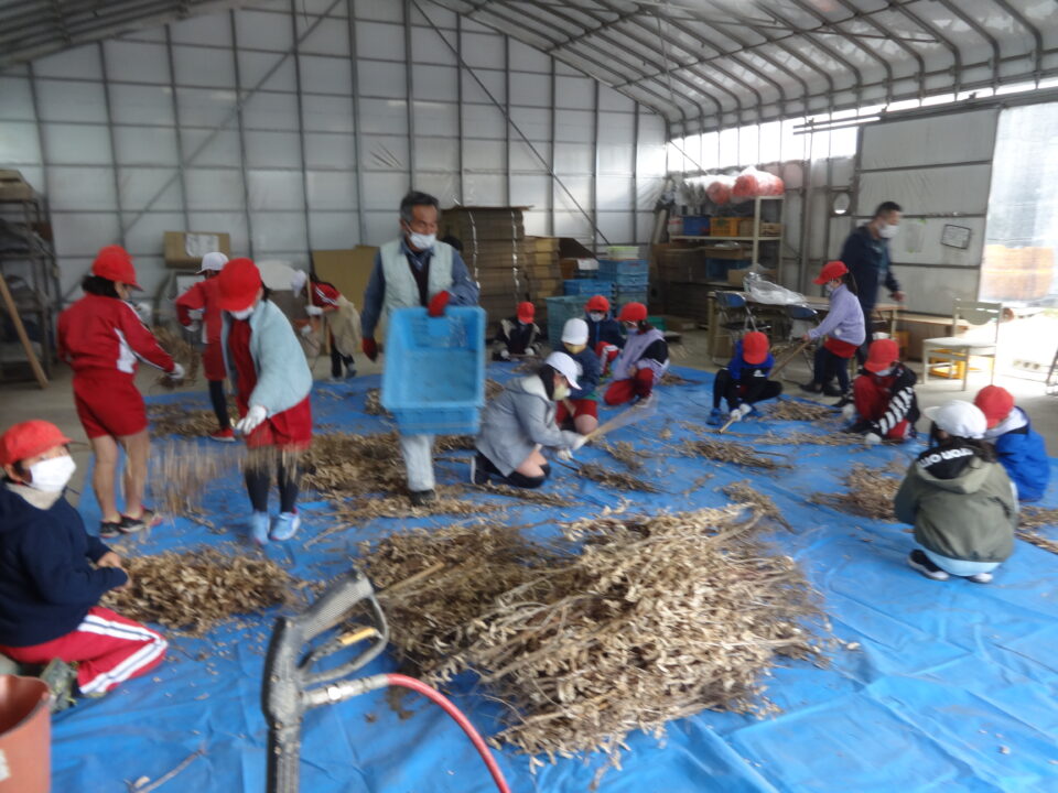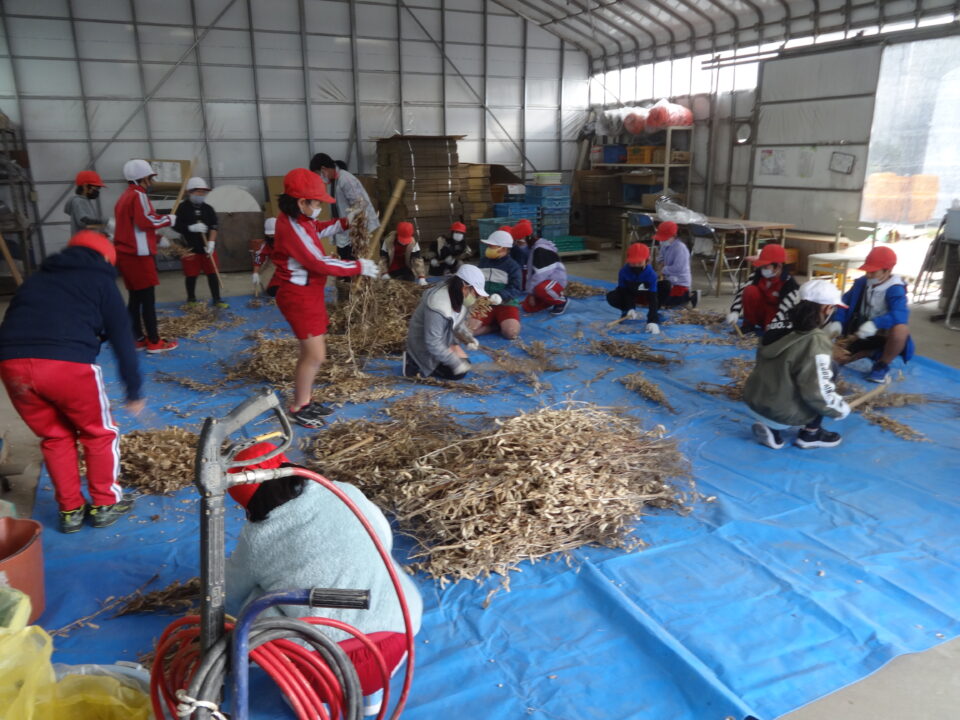7月6日(火)に3年生がCS(コミュニティ・スクール)委員もしていただいている地域の方の畑をお借りして、育てていた大豆の収穫を11月26日(金)に行いました。また、11月30日(火)には倉庫をお借りして大豆の取り出し作業を体験しました。