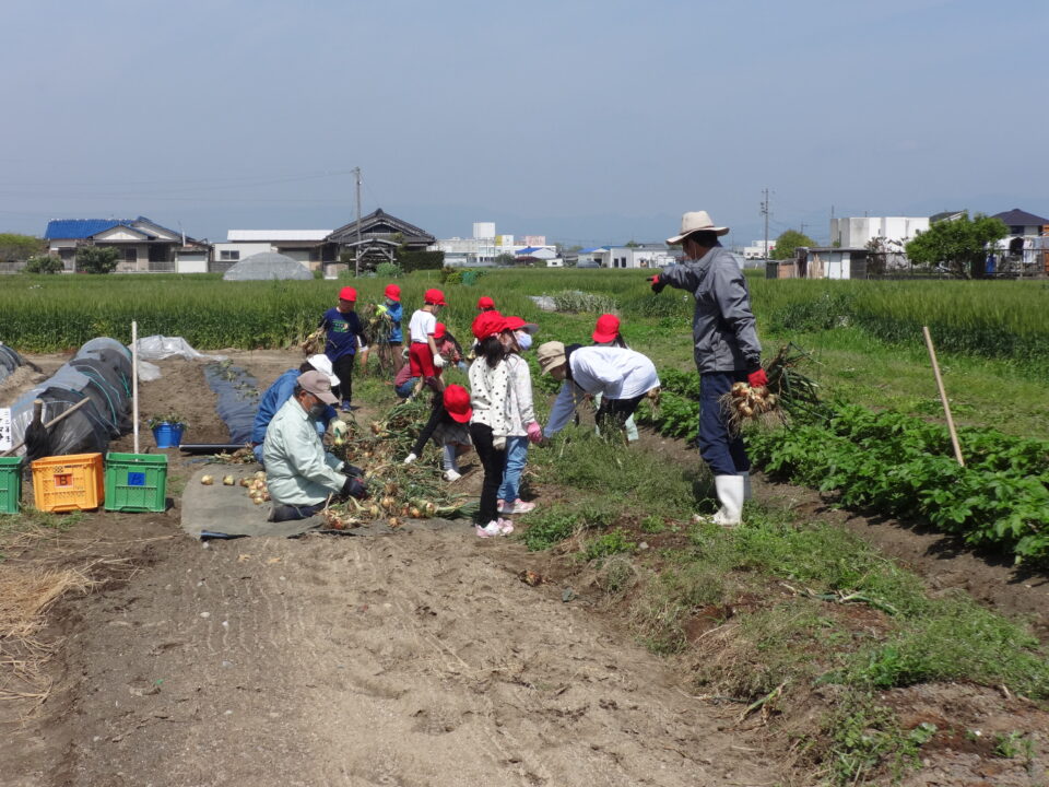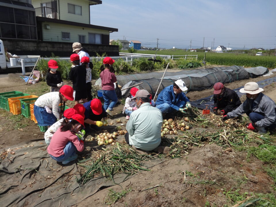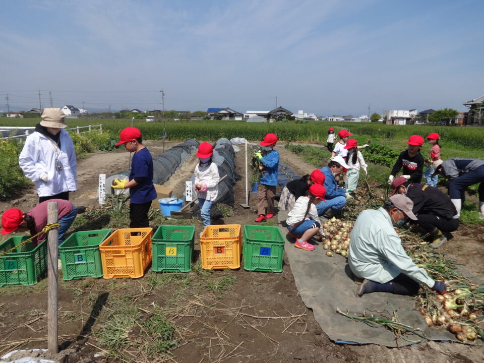 4月28日(金)2限目に地域の環境保全協議会の方にお世話になり、1年生が昨年の1年生が11月ごろに苗を植えた玉ねぎの収穫をしました。みんなでがんばって楽しく収穫し、とれた玉ねぎを手でふいて土をとり、籠に入れましました。