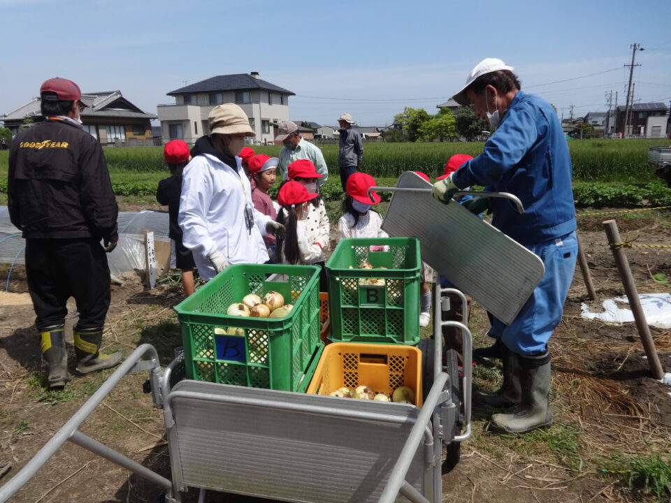 今日は玉ねぎを袋に入れて持ち帰ります。お家で収穫した玉ねぎを使って、料理をして食べてほしいと思います。よろしくお願いします。