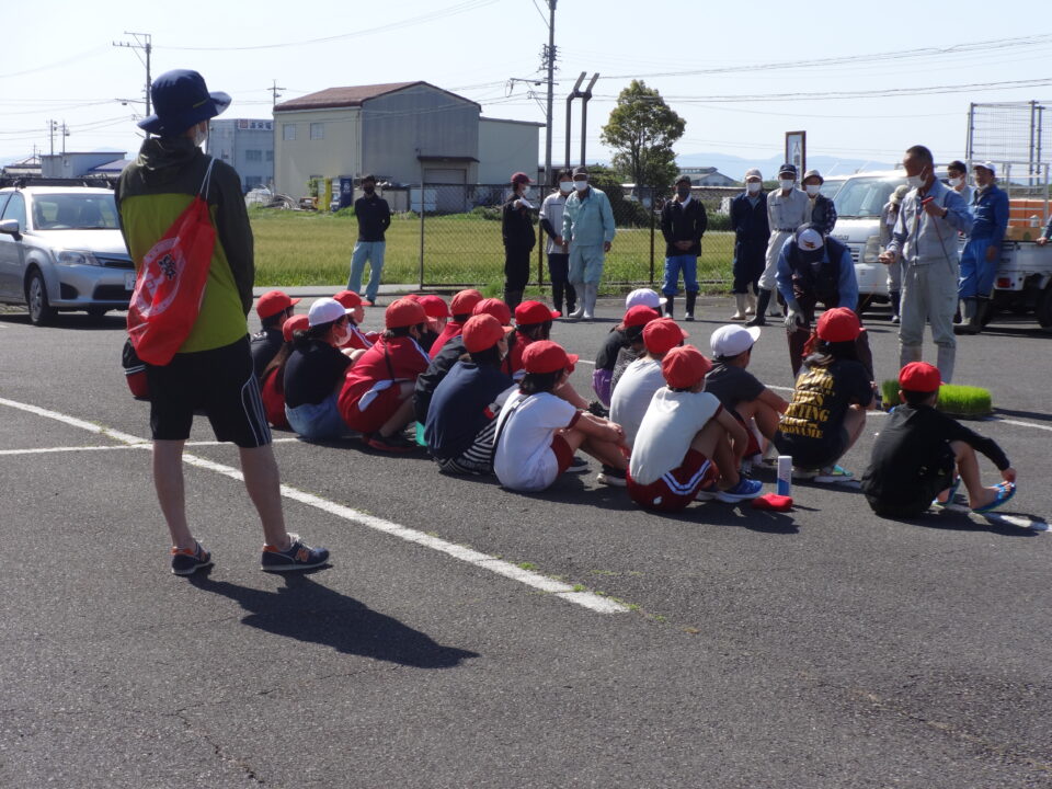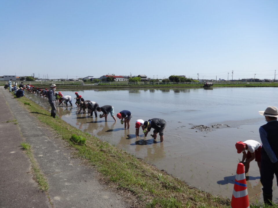 田植え体験では、体育館横の地域の田をお借りし、地域の営農組合の方を中心に、JA、笠松、星合、五主環境保全協議会、和合コンサルタント等のみなさんにお越しいただき、子どもたちに田植えのご指導をいただきました。