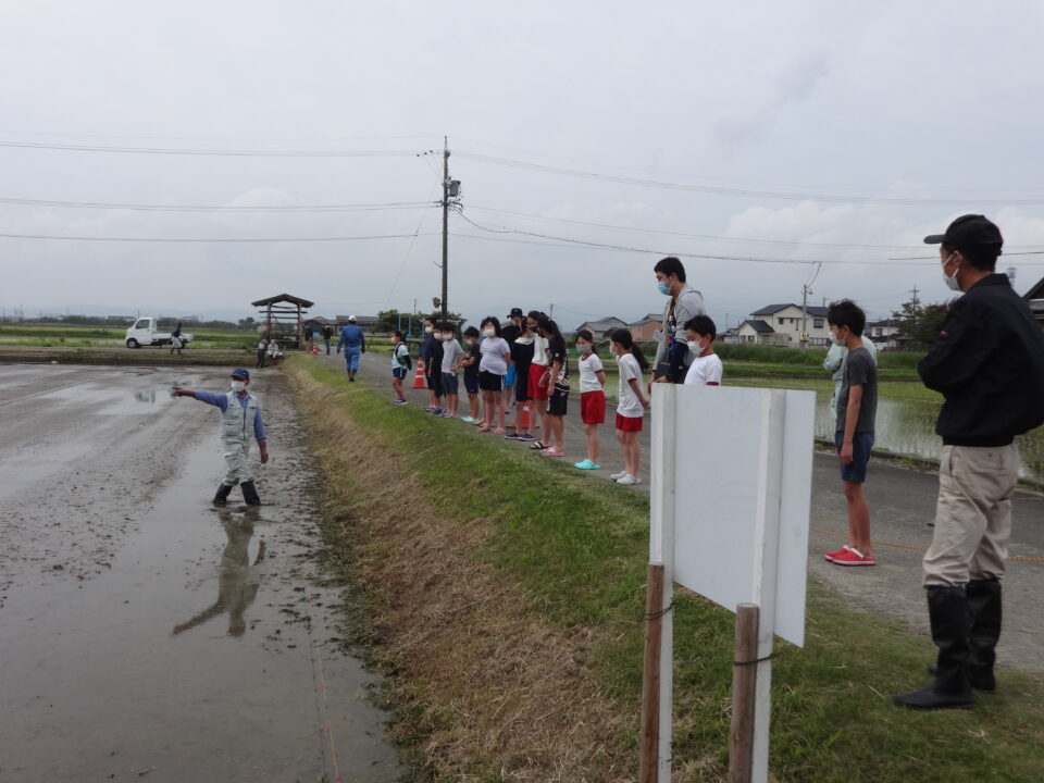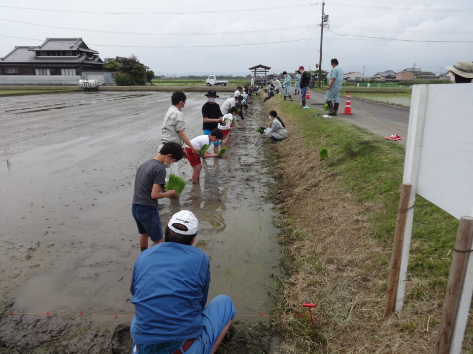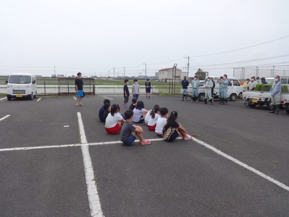 田植え体験では、地域の田をお借りし、営農組合の方を中心に、JA、笠松、星合、五主環境保全協議会、和合コンサルタント等のみなさんにお越しいただき、子どもたちに田植えのご指導をいただきました。