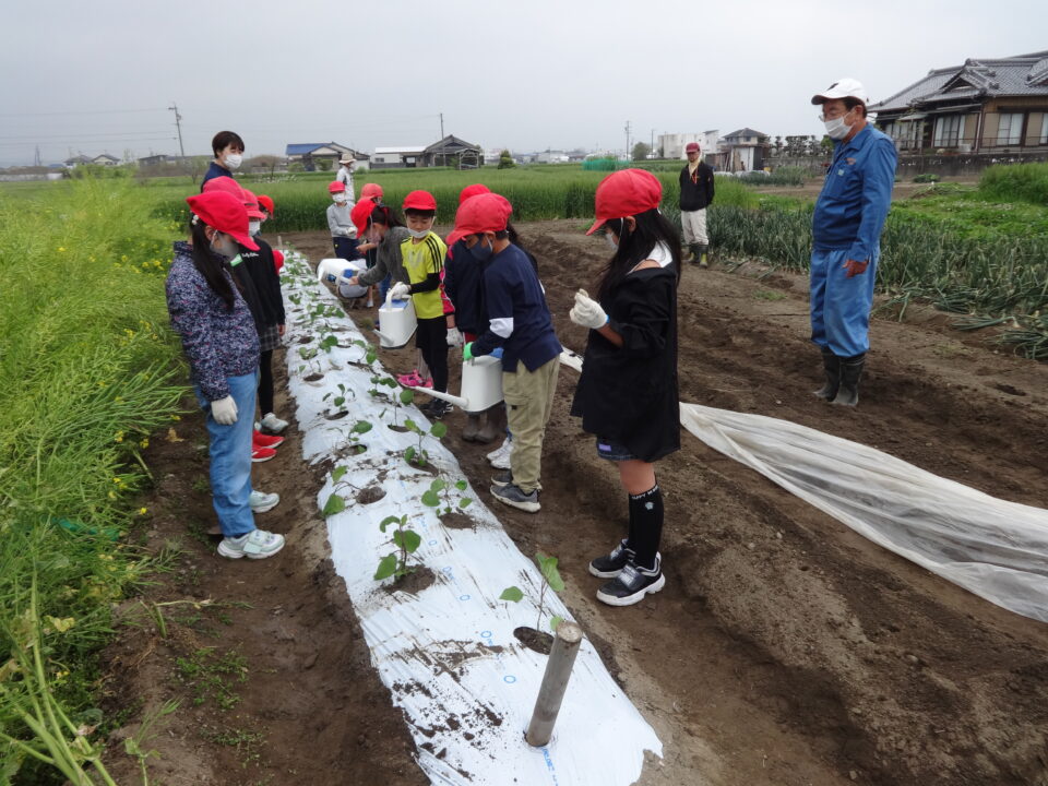 4月21日(木)の1限目、3年生が地域の環境保全協議会の方にお世話になり、学校前の畑で「なす」の苗植えをしました。