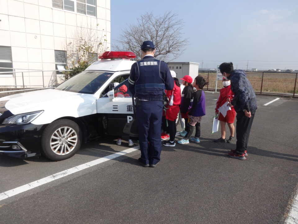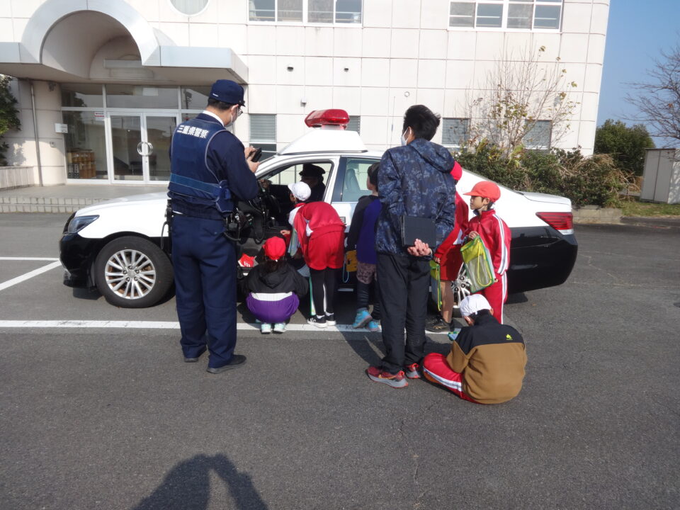 子どもたちはパトカーに乗せてもらい、ナビの説明を受け、興味を深めて学習していました。