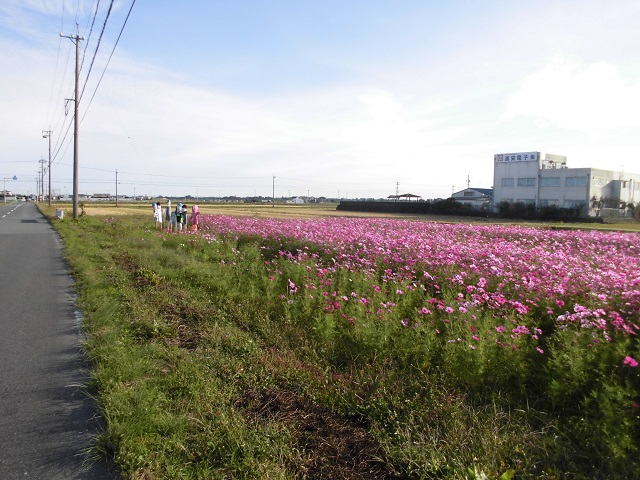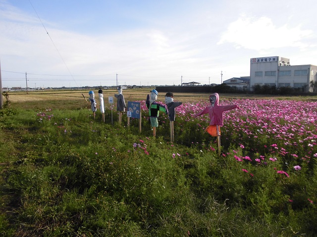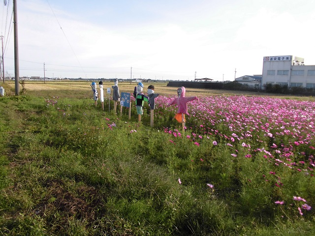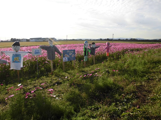 産業道路に面した休耕田に笠松営農組合さんがコスモスを植えてくれました。見頃を迎え、色鮮やかなピンク色が遠くからも確認できます。そしてコスモスの前には昨年度の5年生(現6年生)が営農組合の方々と作ったかかしを並べてもらいました。朝日、コスモス、かかしの風景は見事です。近くには十軒屋の児童の通学路で産業道路を横断する箇所があります。児童が横断する箇所なので、ドライバーの注意をひき、交通安全につながればありがたいです。