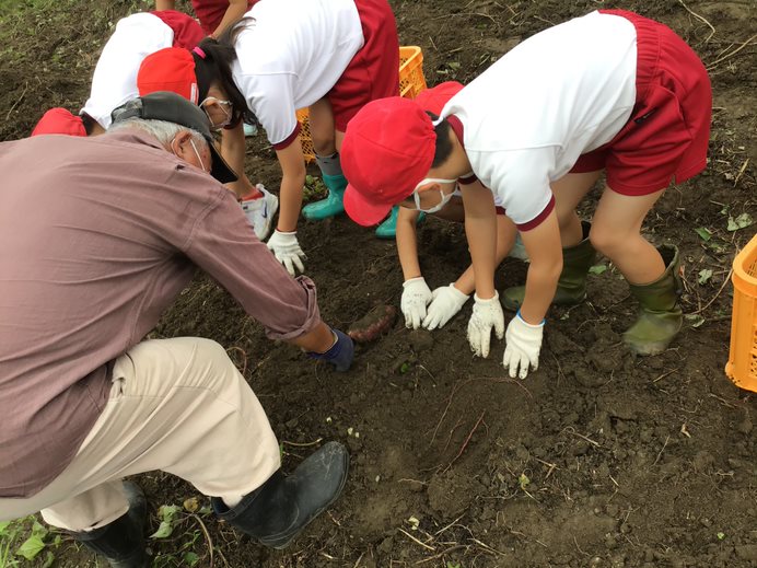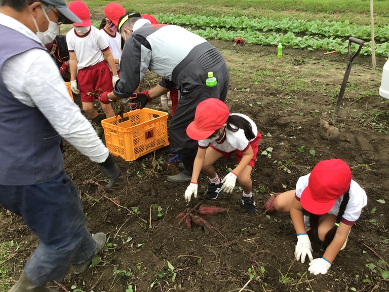 4月に植えた苗の土の中をたどっていくと、なんと、とても大きなさつまいもがたくさん出てきました。子どもたちはさつまいもを見て喜ぶとともに、その大きさに驚いている様子でした。地域の環境保全協議会のみなさんに掘り方を教えていただきながら、とても楽しそうに掘っていました。とれたさつまいもは、お家に持ち帰りますのでよろしくお願いします。