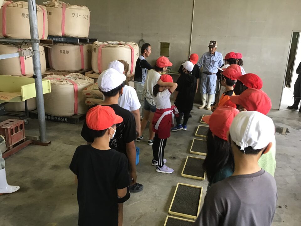 子どもたちはやり方を教えてもらい、苗箱の中の土の上に均等にまいていきました。体験が終わると、質問をして学習を深めました。