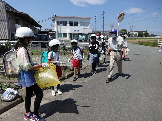 地域の環境を大切にするための取組として、地域のみなさんとゴミ拾いを行いました。下校時に各通学班でゴミ拾いをしました。班長さん、副班長さんが持つゴミ袋に、拾ったゴミを入れました。