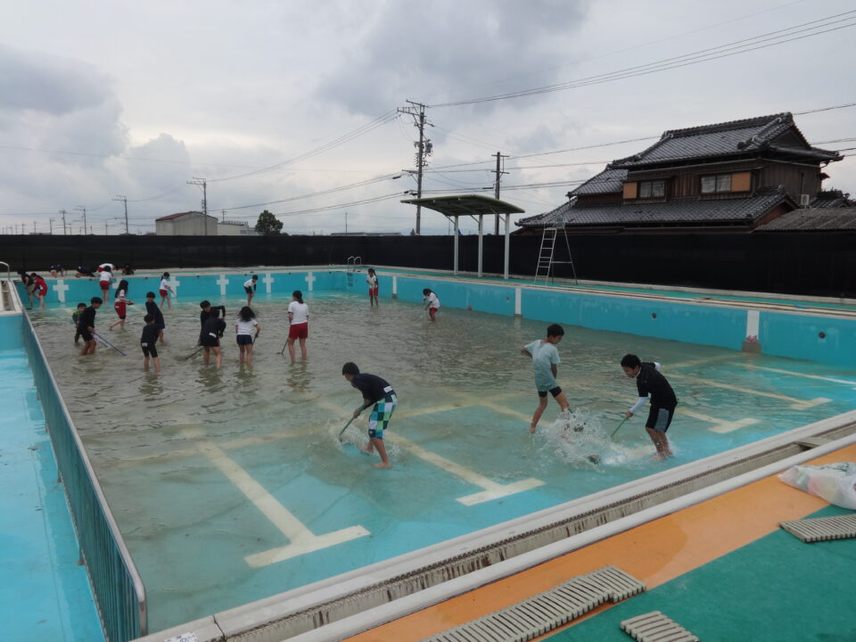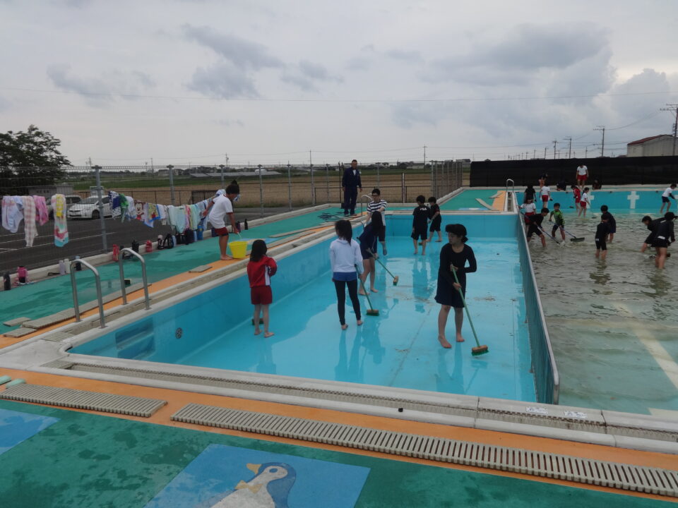 大プールの排水が完全に抜けにくい中、最後まで意欲的に取り組めました。みんなで力を合わせてがんばる楽しさやきれいにすることで気持ちよさを感じることができました。
