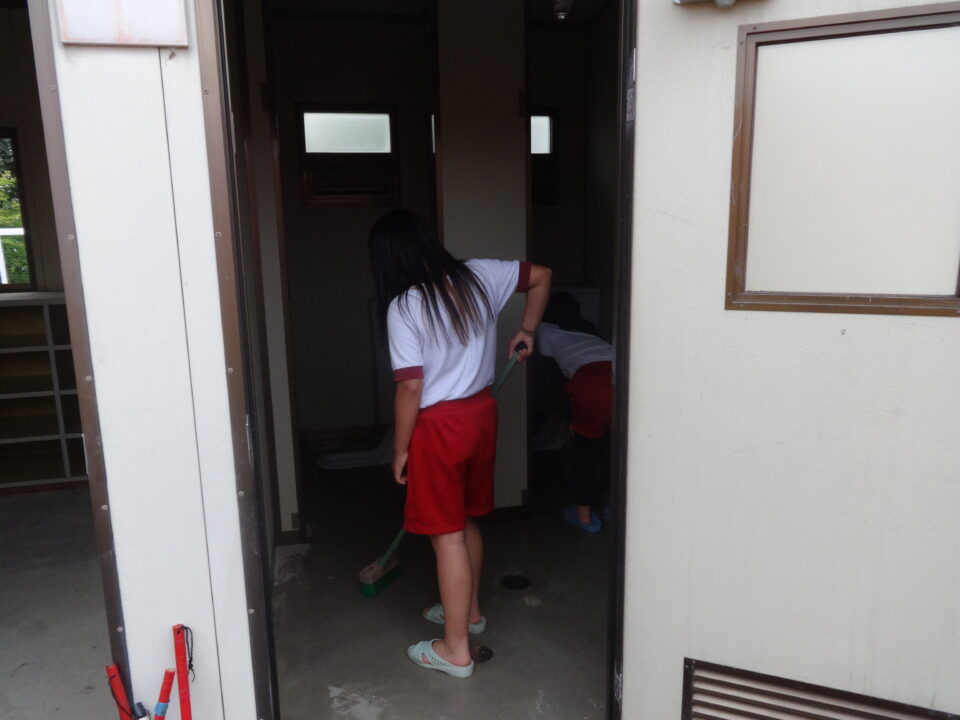 4年生は、更衣室、トイレ、シャワー、用具庫、通路を中心にほうきで掃いたり、デッキブラシで床をこすったりして、きれいにしました。
