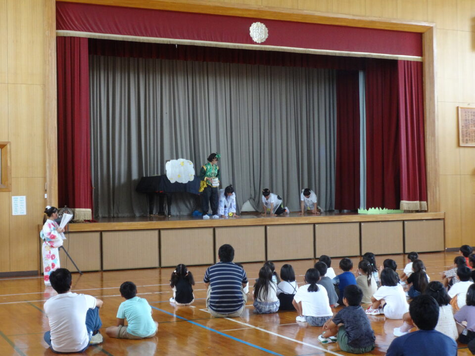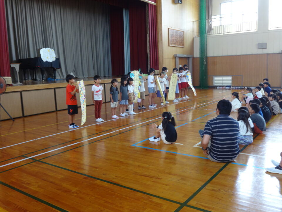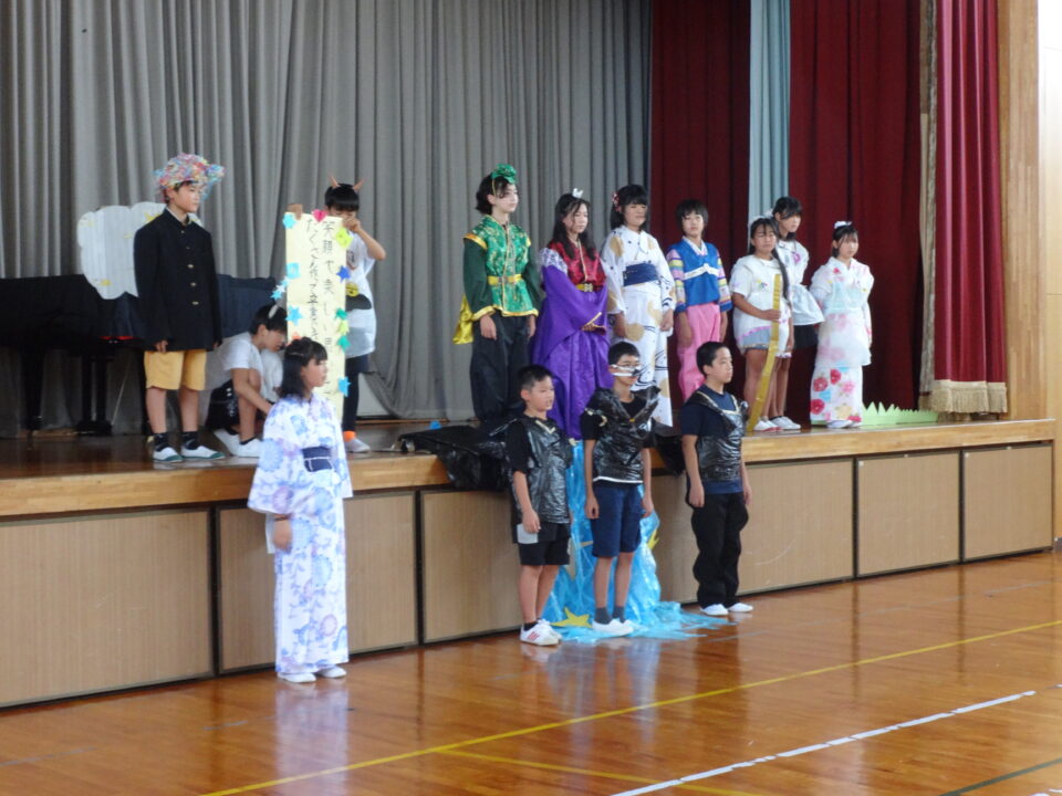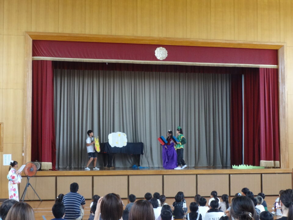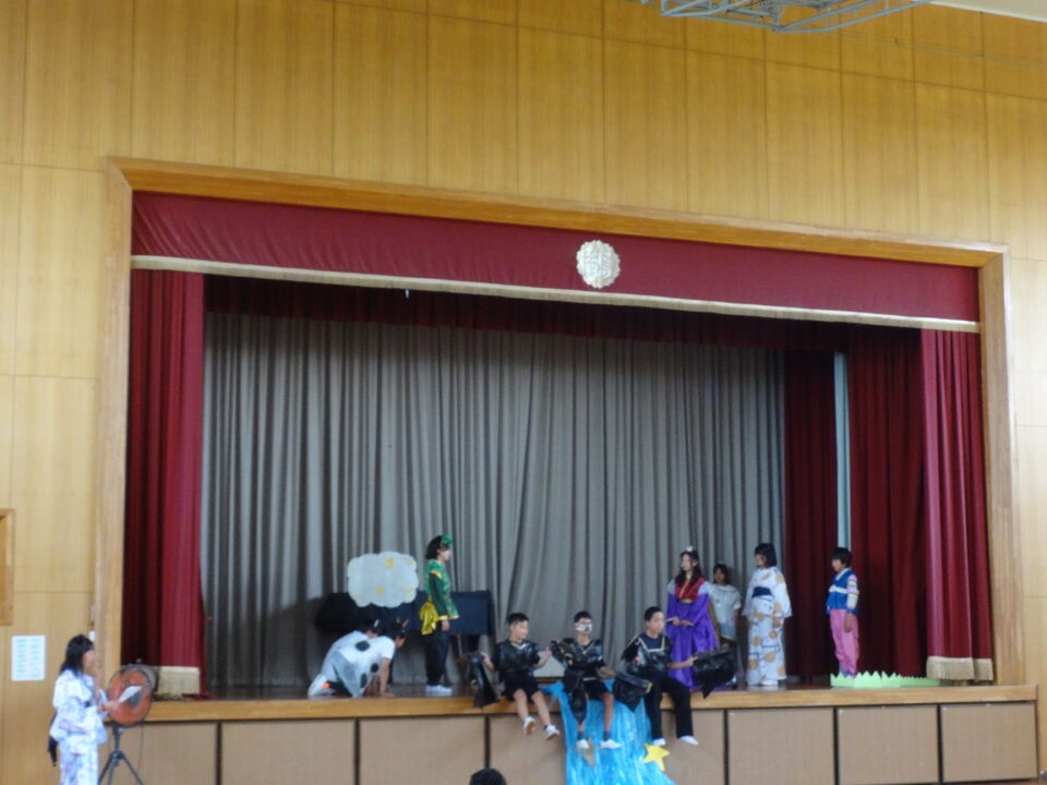 今年度も各学年の代表者による願い事の発表と6年生の「七夕の劇」を発表しました。これまで一生懸命準備をして取り組んできました。とてもよくがんばってきたその成果を工夫して十分発揮することができました。6年生のすばらしい努力とチームワークでとても楽しい七夕の劇を見せてもらうことができました。