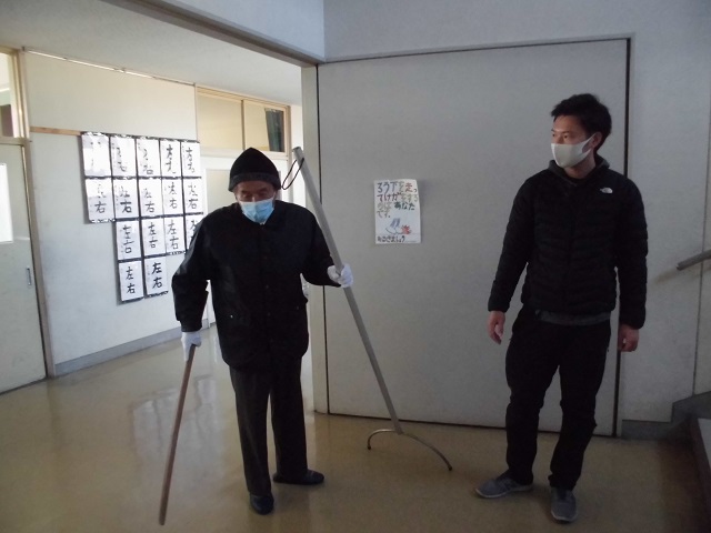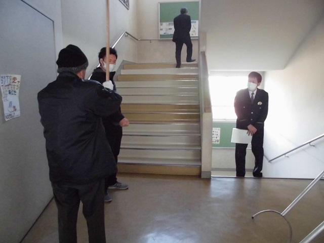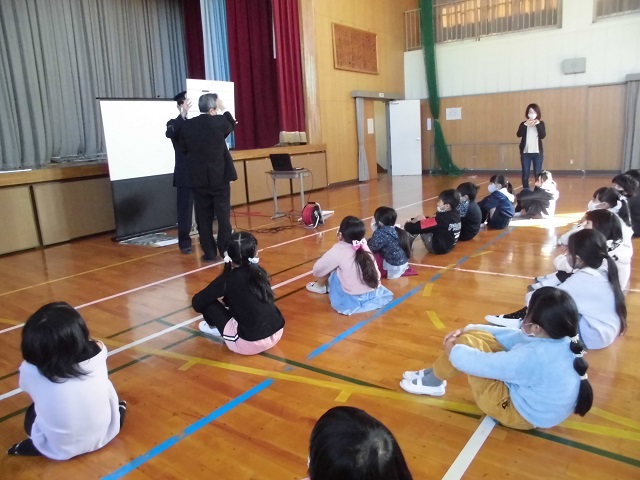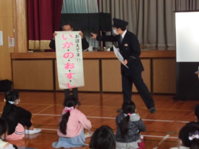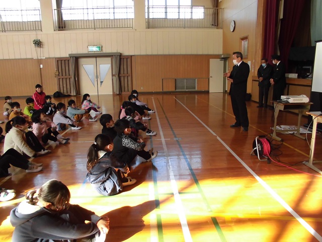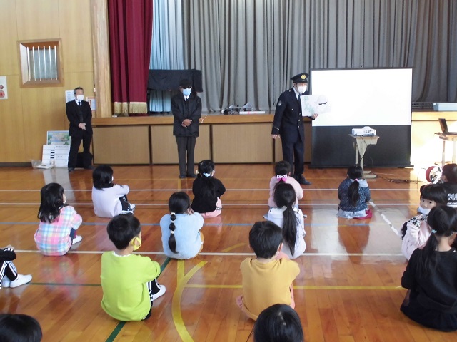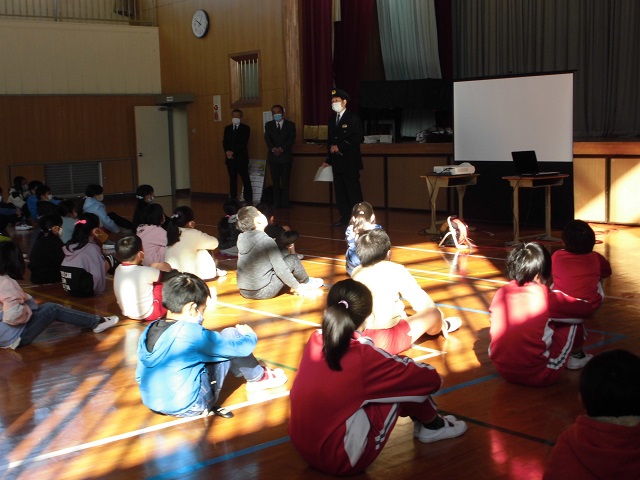 今日は松阪警察から警察官に来てもらって、不審者が校内に侵入し、3階教室付近にいることを想定し、不審者を刺激しないように身を隠したり、避難する訓練を実施しました。避難後体育館で講評を聴き、不審者に出会ったときどのように対応するか教えてもらいました。その後1,2年生は防犯や交通安全について話を聴きました。子ども達は真剣に話を聴いていました。