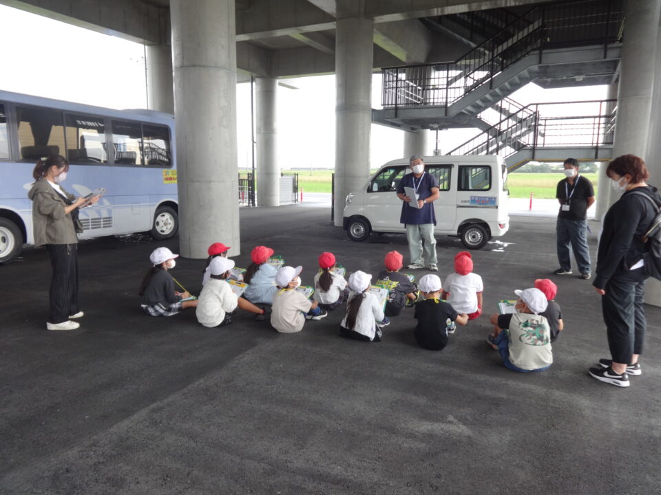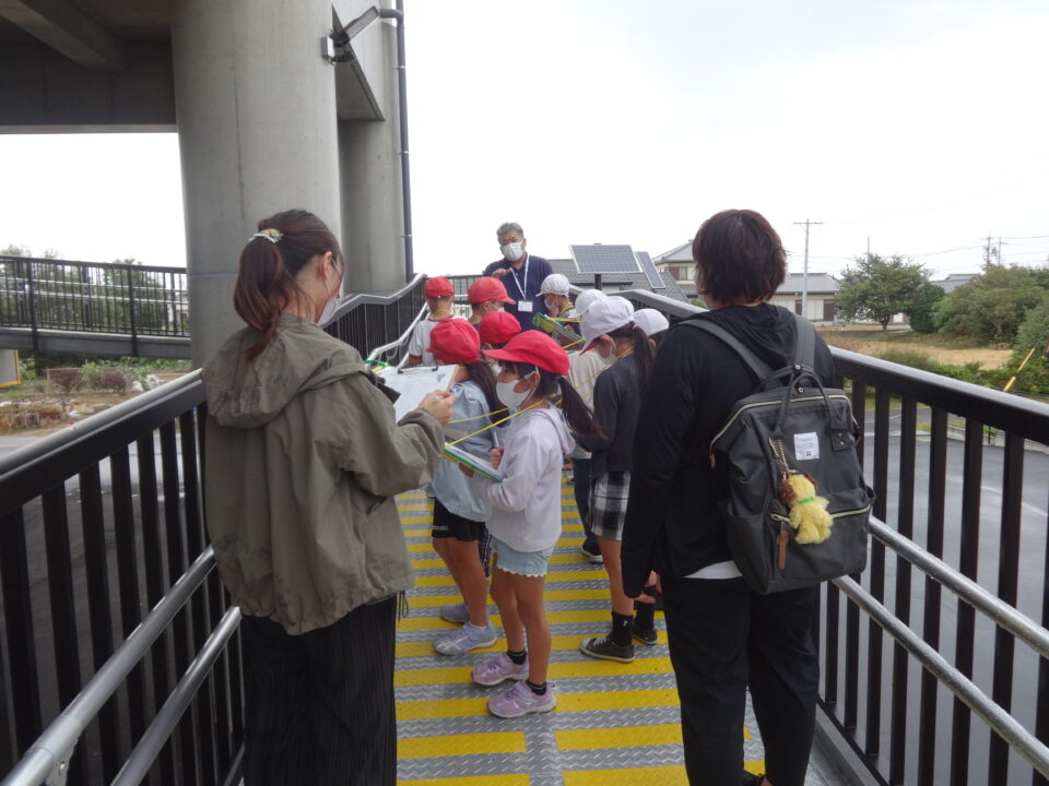 10月3日(月)3・4限に、生活科「わたしの町はっけん」の学習で、三雲振興局のバスに乗って、五主町にできた津波避難タワーを見学に行きました。