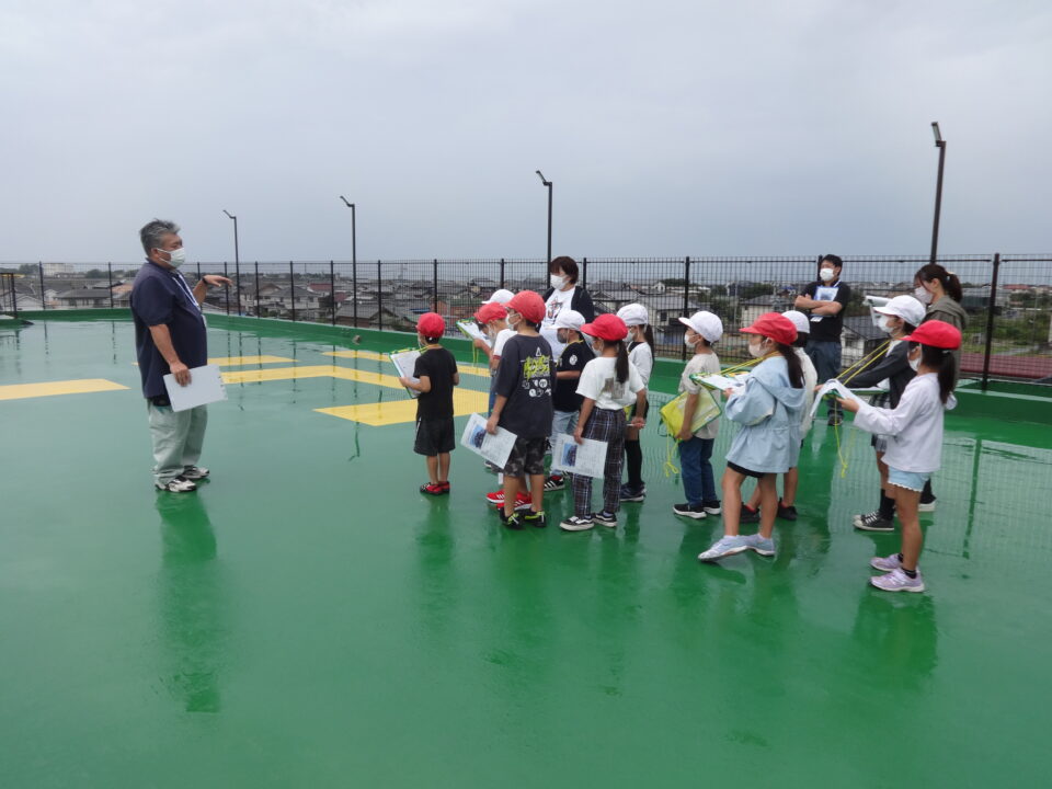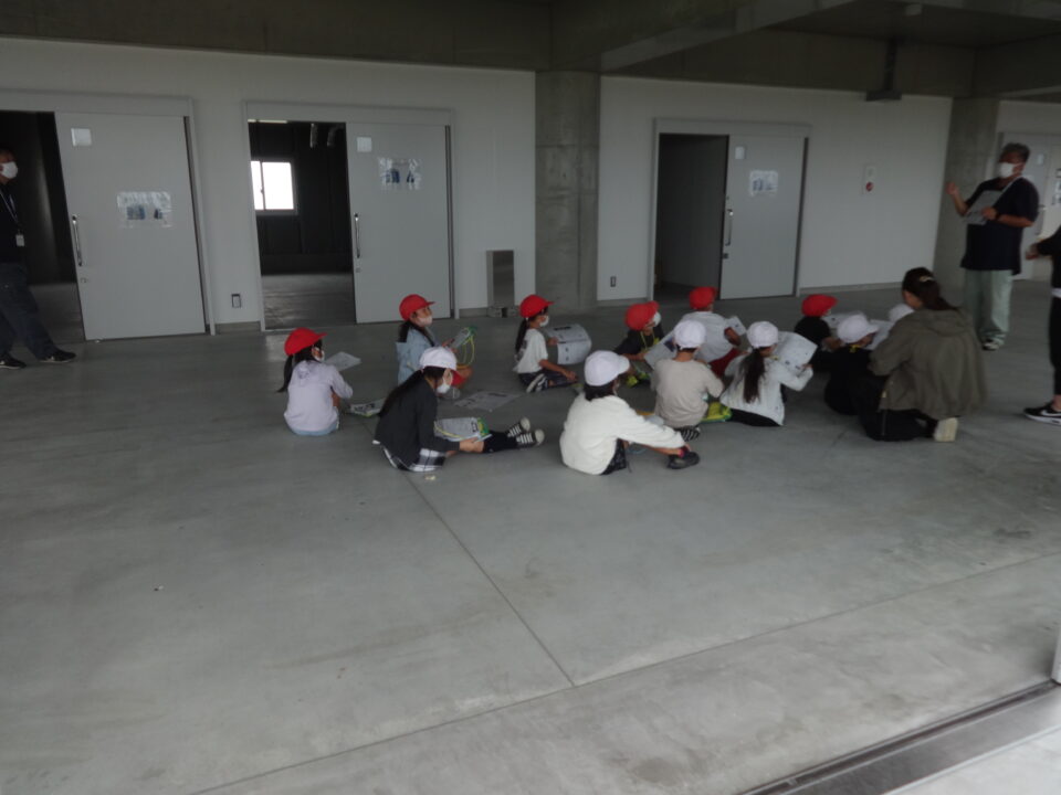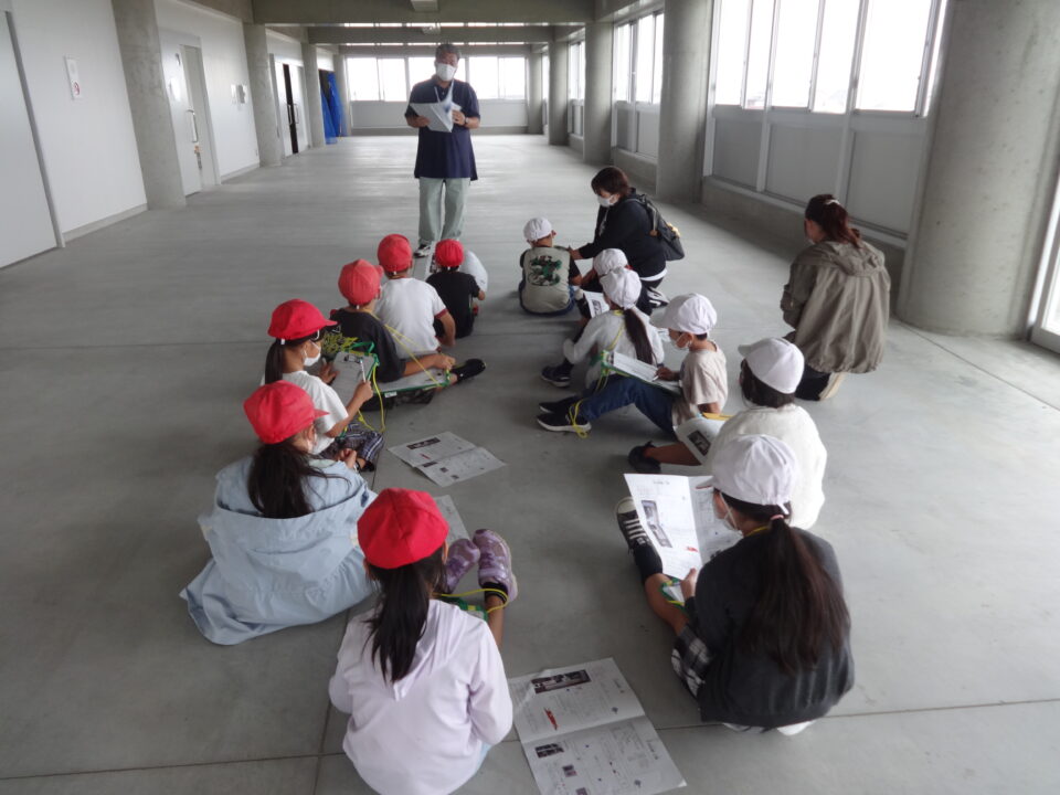 津波避難タワーは、786人が避難できること、備蓄品には、非常食、水、毛布等があるが、水が引いていくのに1週間を想定しているため、備蓄品の量は限られているので、持てる物はそれぞれで持ってきてほしいこと、仮設トイレのあつかいのこと、屋上の高さは13mあること、ヘリコプターからの救助のこと、太陽光蓄電のこと等、子どもたちは説明をしっかり聞いて、メモをとることができました。