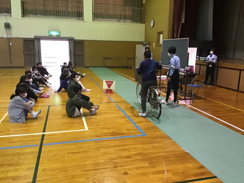 体育館でお話を聞いたり、ビデオを見て学習したりしました。また、学年に応じて、自転車点検の大切さや自転車に乗るときのルール等の話の後、実際に自転車の乗り方を見て学んだり、自転車に乗って体験学習をしたりしました。