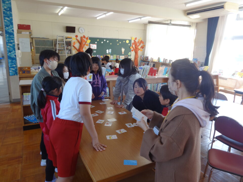 12月4日(月)の20分休みに図書室で、CS委員の読書活動部のボランティアさんによる「スリーヒントカードゲーム」を子どもたちにしていただきました。三つのヒントからそのカードの絵をとるゲームです。集まった子どもたちは「かるた」のように真剣にとりあって交流できました。