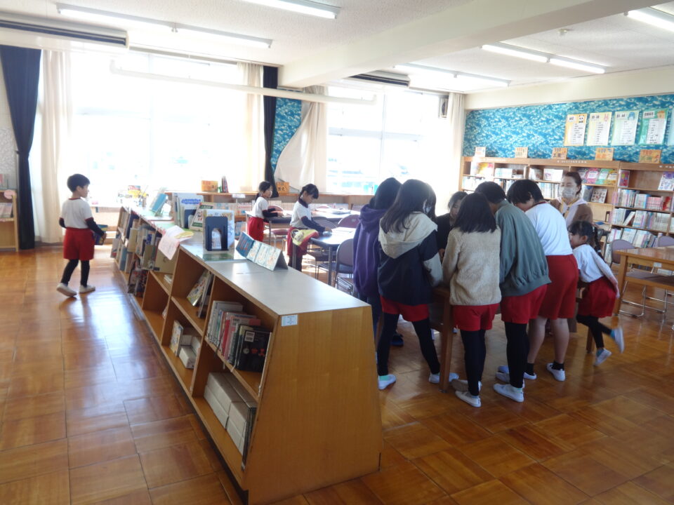 コミュニティ・スクール(CS)の取組で、休み時間に図書室でボランティアさんによる読み聞かせ等を行っています。