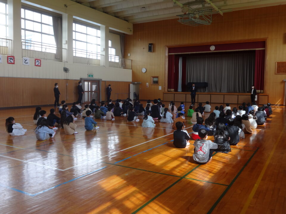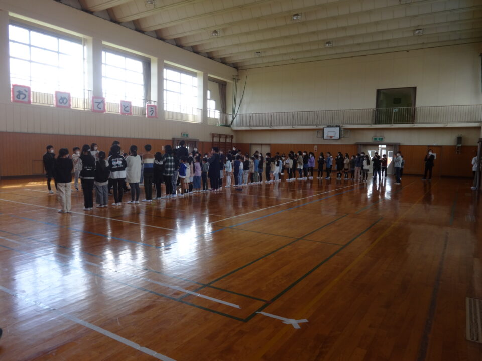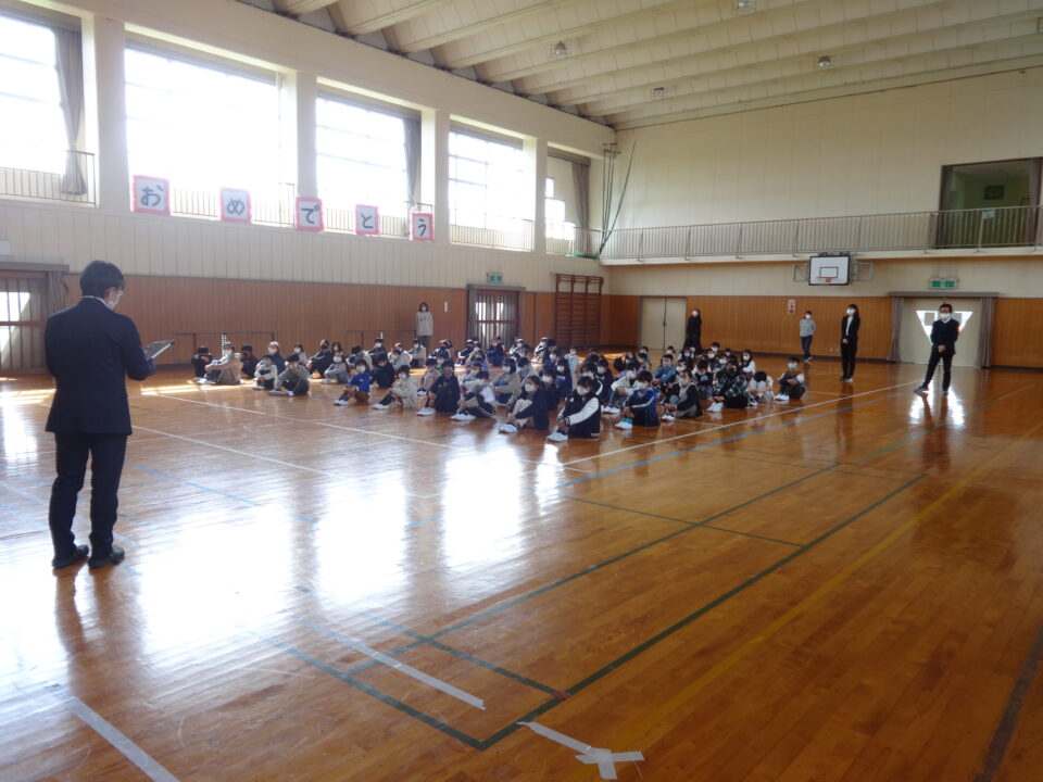 修了式の後、離任式を行いました。離任される先生から、一人ひとりお話をしていただきました。その後、子どもたちから、花束が渡されました。最後に、子どもたちの中を通って退場してもらいました。お世話になった先生方と子どもたちの名残惜しい様子がとても印象的でした。