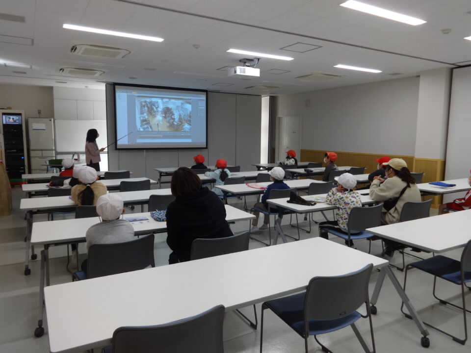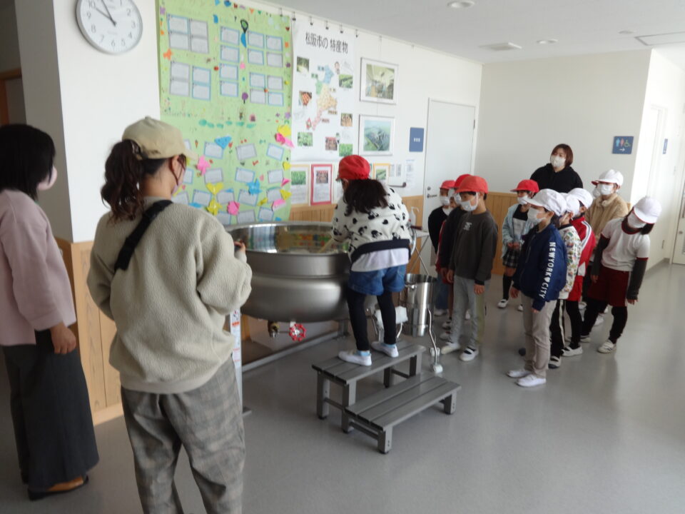 その後、実際に鍋を使って、鍋に入ったボールやペットボトルをかき混ぜる体験を、一人ひとりがさせてもらいました。みんなが力を入れてかき混ぜる体験から、かき混ぜる重さを感じることができ、調理員さんの仕事の苦労を学びました。その後、モニターで炊飯の様子等も見せていただきました。