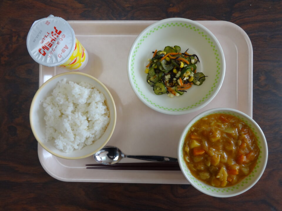 栄養教諭の先生に全体の様子を説明していただいた後、その日の給食づくりの様子を部屋の上から見学しました。カレー、ひじきとチーズのサラダをつくっているところでした。大きな鍋で北部の児童生徒の給食をすべてまとめてつくっていました。調理員さんの一生懸命働いている様子も知ることができました。