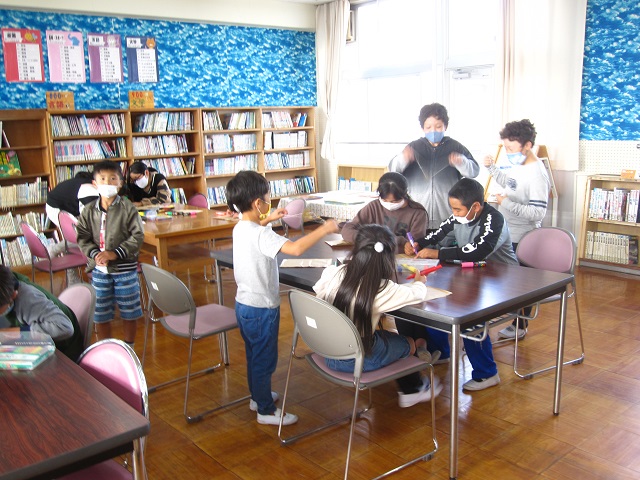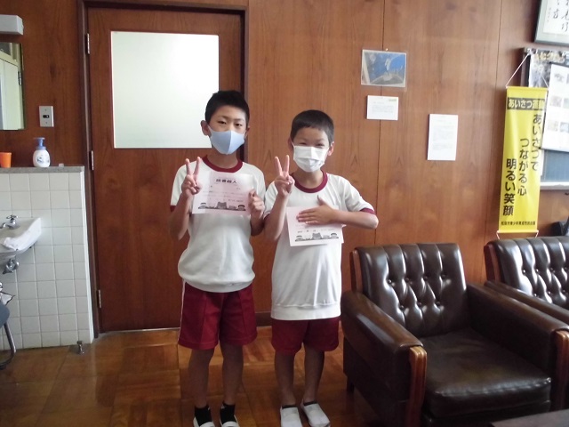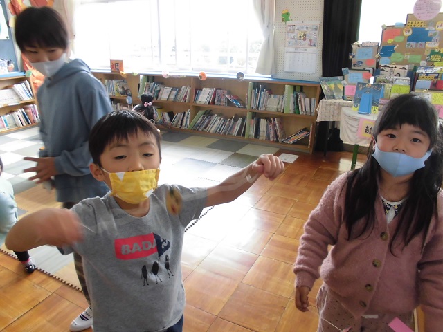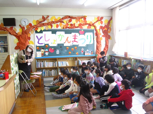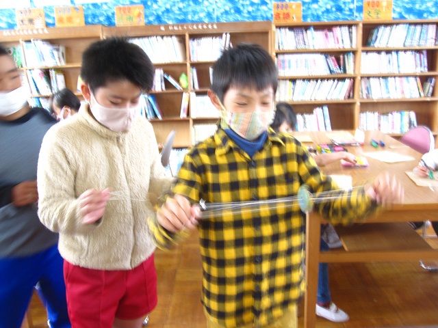 5日から図書館まつりが始まりました。図書委員さんががんばって活動しています。今日は地域の方に来ていただいて休み時間に読み聞かせをしてもらいました。「びゅんびゅんごまがまわったら」という絵本で、実際にびゅんびゅんごまを作って、回してみました。うまく回らない子には上級生がやさしく教えていましたよ。10月22日、1万ページ読破の読書超人(3年生男子2名)が誕生し、校長室で表彰しました。どんどん読書しましょう。