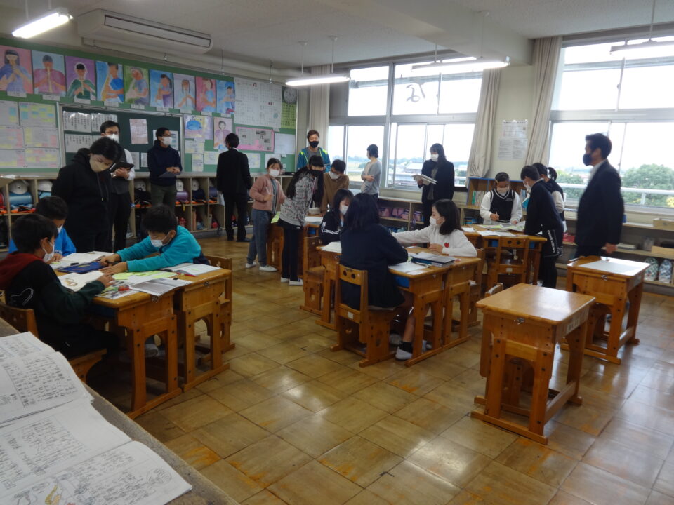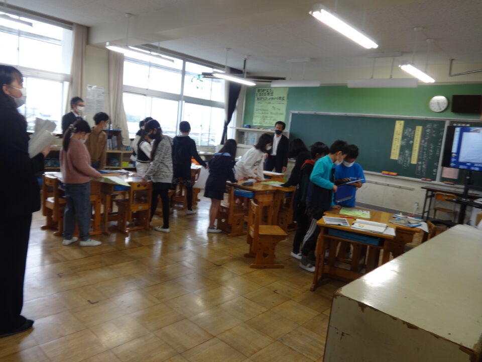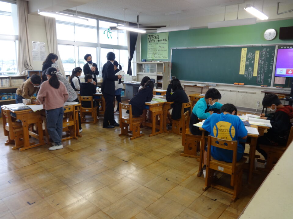 11月1日(火)3限目に5年生の国語「たずねびと」の単元の学習に取り組んでいる授業を県市教育委員会の2人の先生と、学校の教職員で参観をしました。