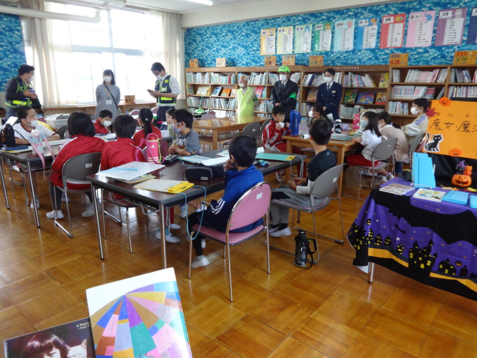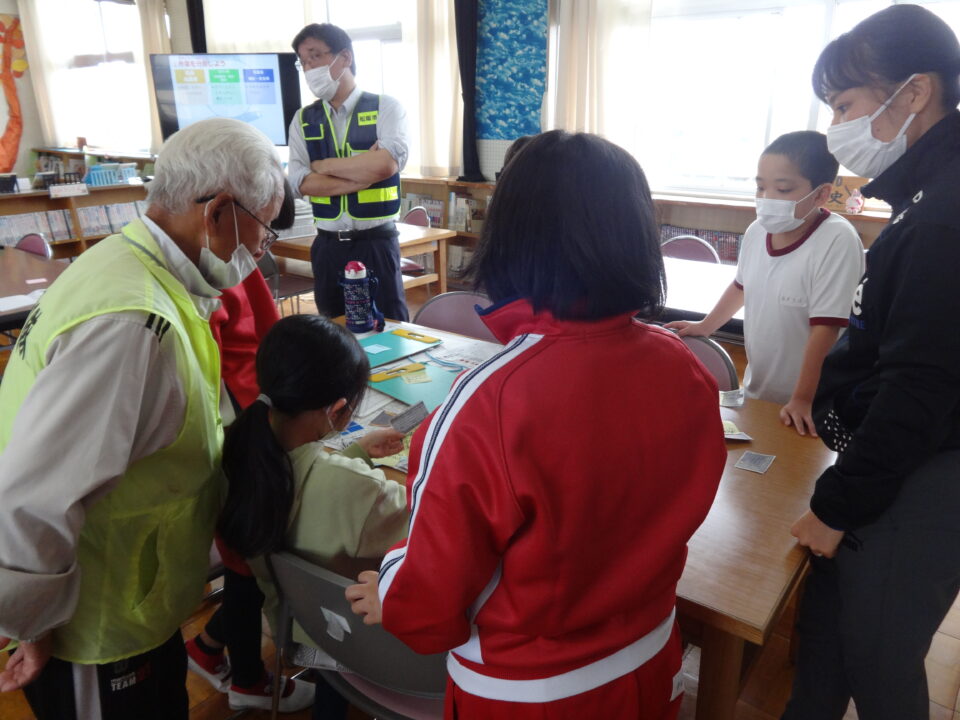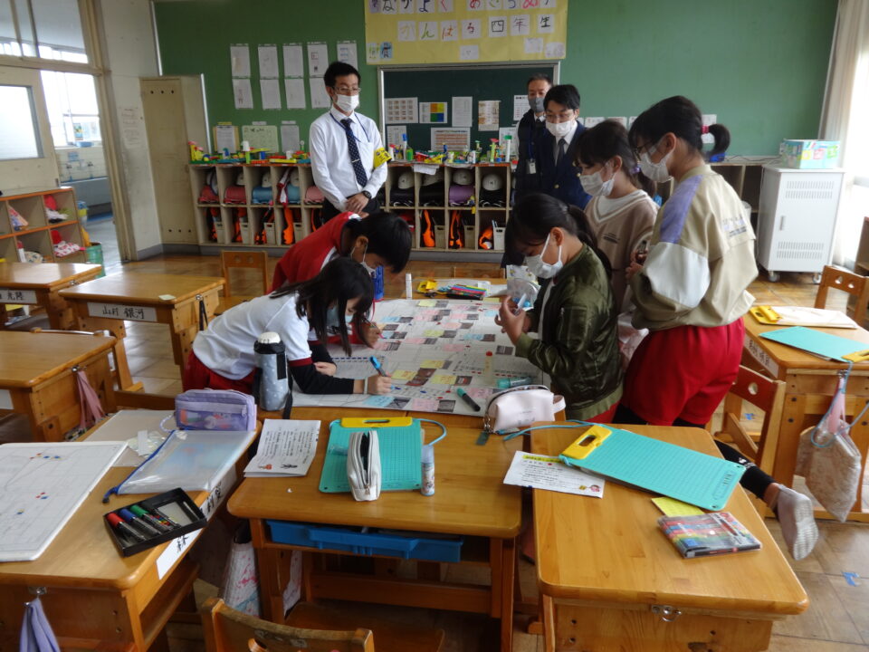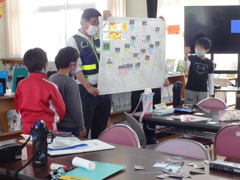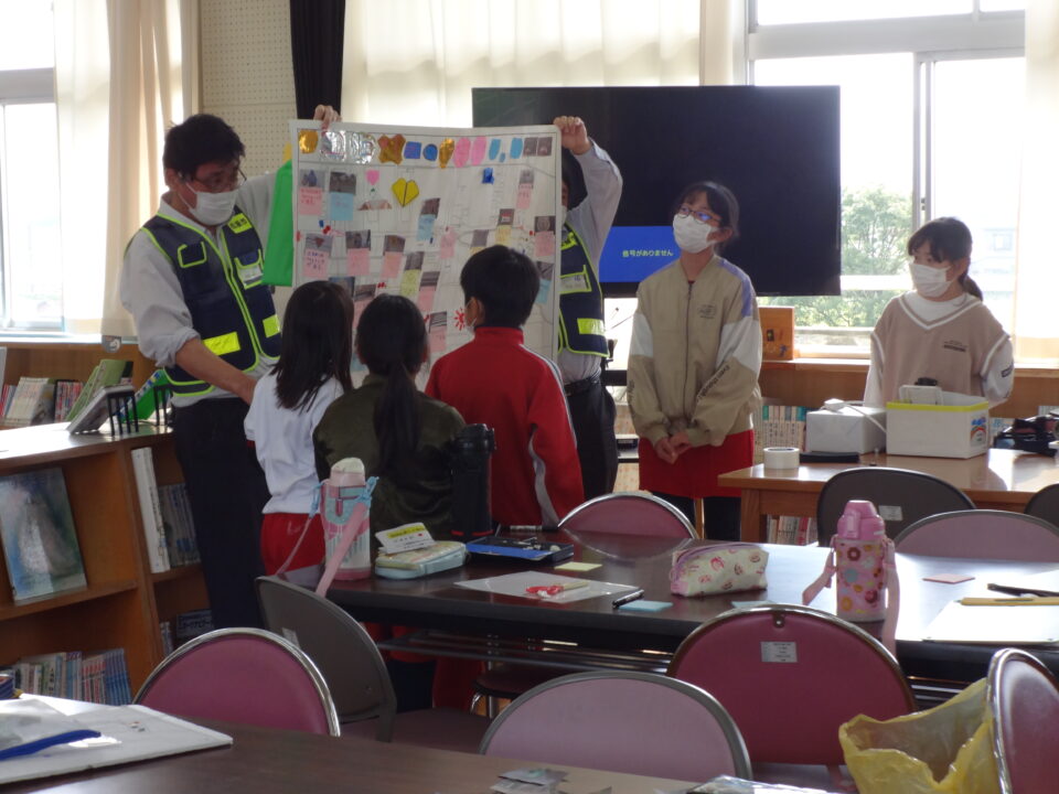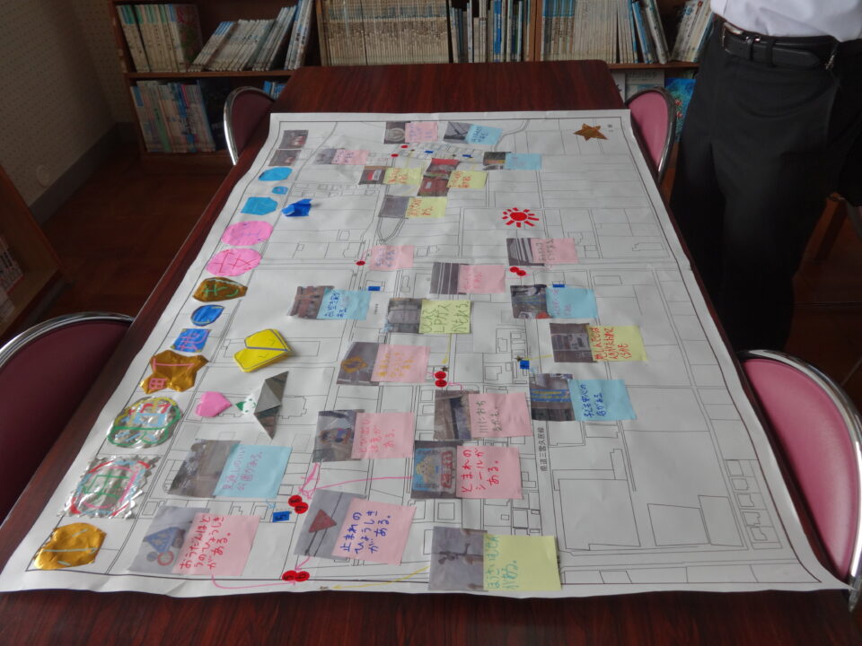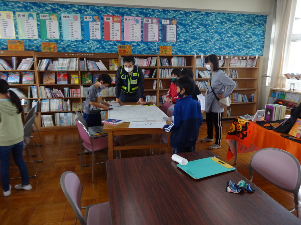 そして、タウンウォッチングのまとめを図書室と教室に分かれて行いました。地図に危険個所の写真や様子を書き込みました。最後に、図書室で全体に発表することができました。