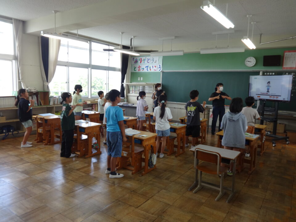今日の3年生の授業では、担当の先生とALT(外国語指導助手)の先生の指導のもと、子どもたちは英語での歌や動作、会話のやりとりを通して楽しく学習ができました。