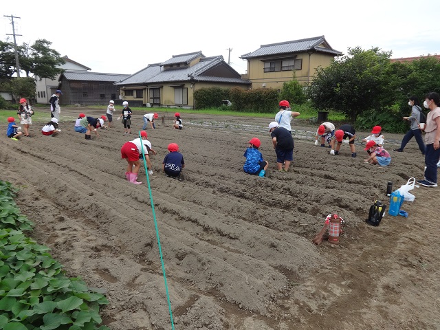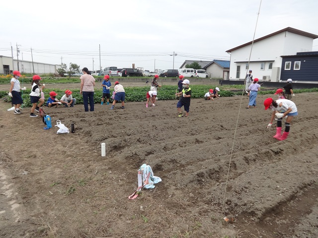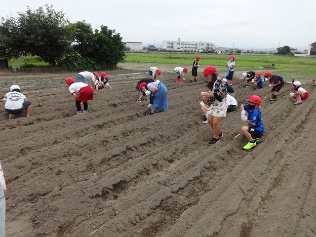 7月6日(火)に3年生が地域の畑をお借りして、大豆まきをしました。CS(コミュニティ・スクール)委員さんもしていただいている地域の方に植え方を教えていただいて、子どもたちも楽しそうに植えることができました。中には、慣れている子もいて、別の場所へも大豆を植えることができました。みんな、よくがんばっていました。