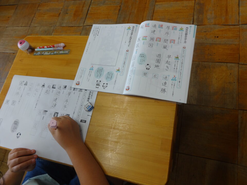 今日の書写は硬筆で、漢字の「内外の組み立て方」を考えて練習する学習でした。漢字には「たれ」「にょう」「かまえ」等のへんやつくりがあります。手本に合わせて正確に丁寧に書く練習です。