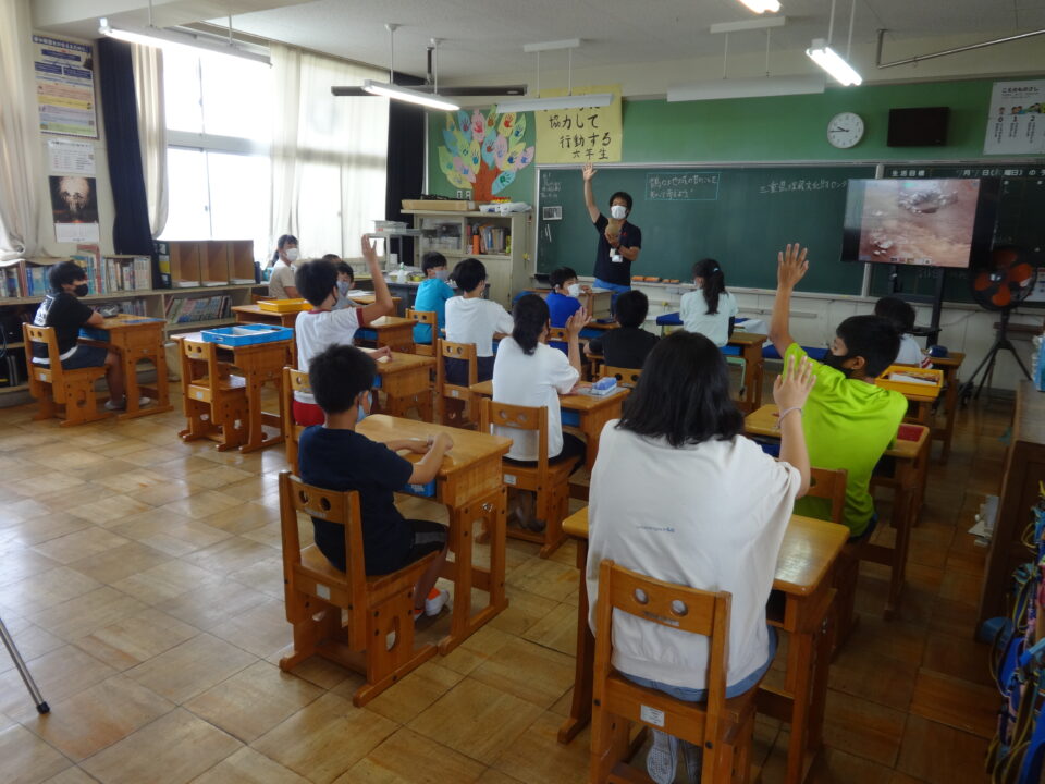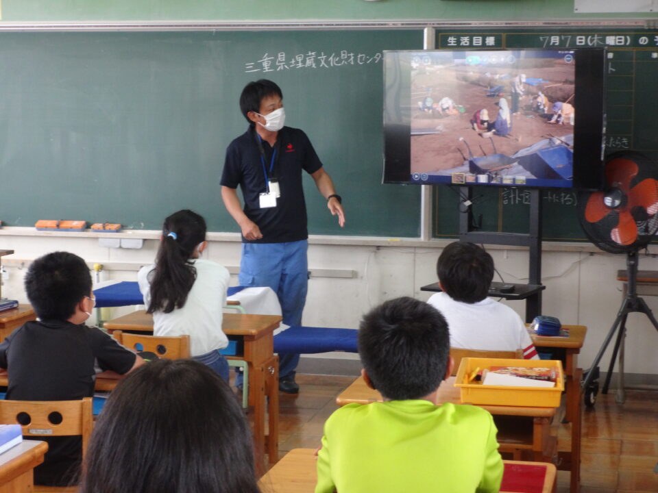出前授業では、三重県埋蔵文化財センターの職員の方にお越しいただいて、楽しくお話をしていただきました。さらに、実際に縄文時代や弥生時代の貴重な土器を見せていただき、学習できました。子どもたちはとても興味をもって学んでいる様子でした。また、「どっちが古い?」では、ペアで土器を見たり、さわったりして考えを深めることができました。