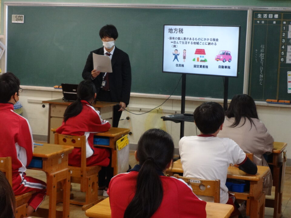 松阪市役所の市民税課の職員の方にお越しいただいて、税の種類や税金の必要性等をお話していただき、子どもたちもしっかりと話が聞けました。