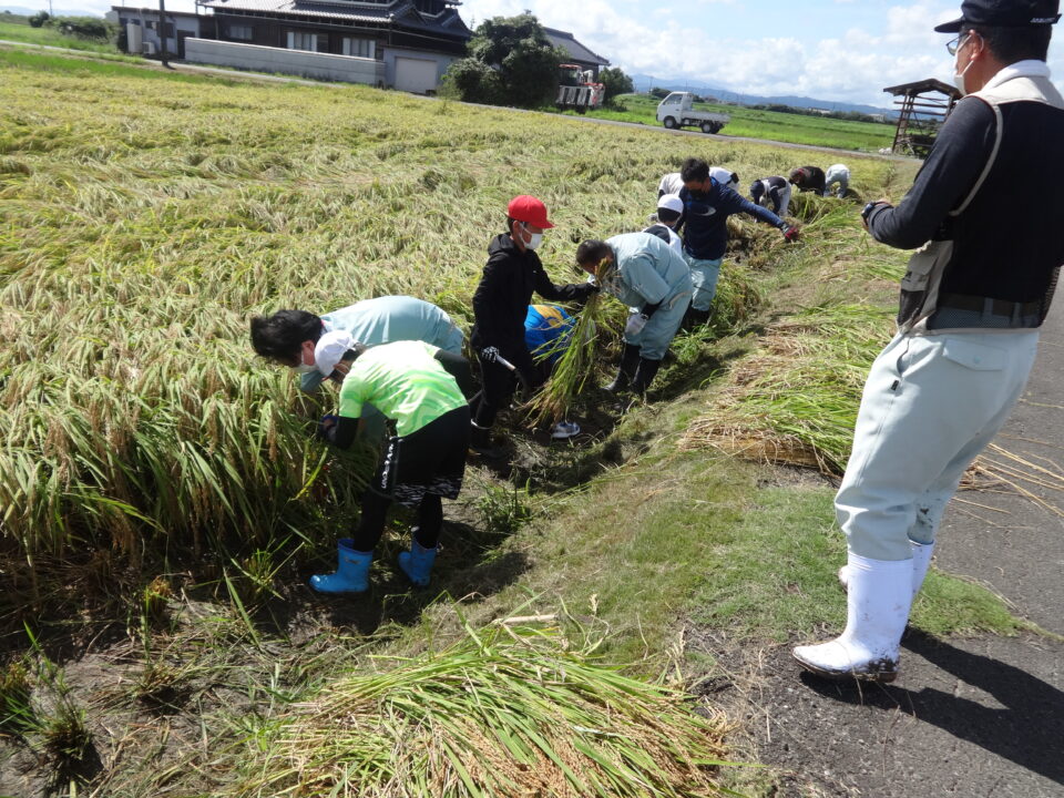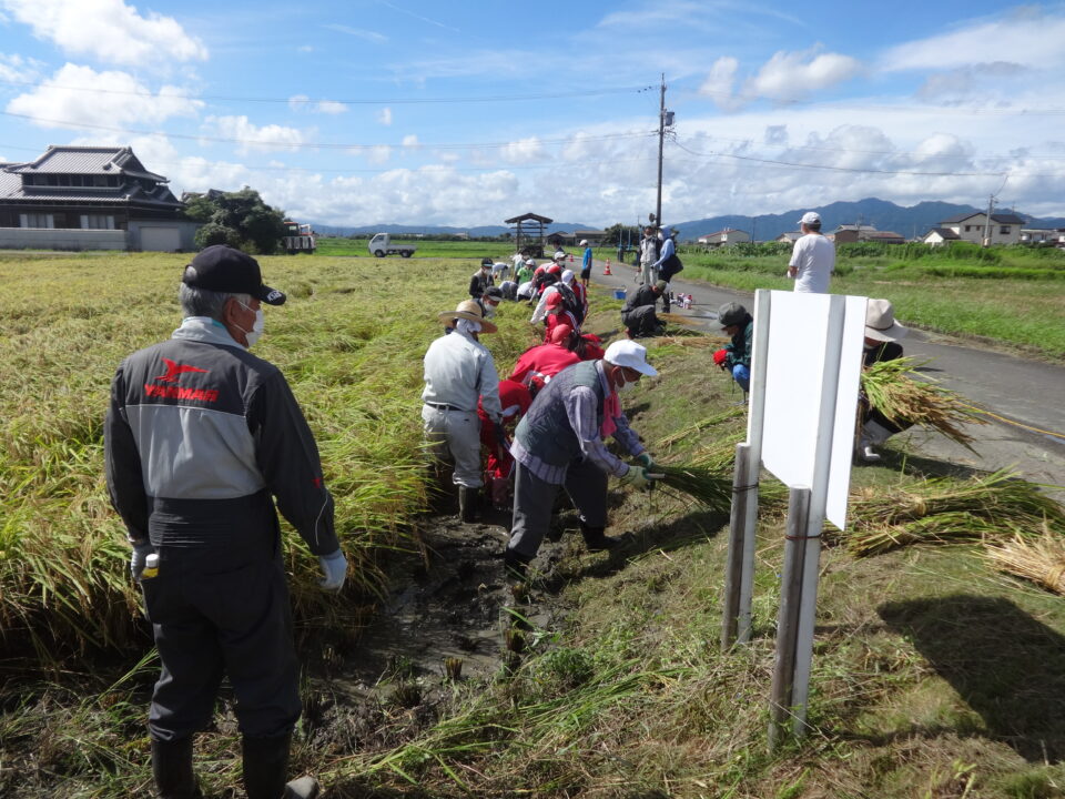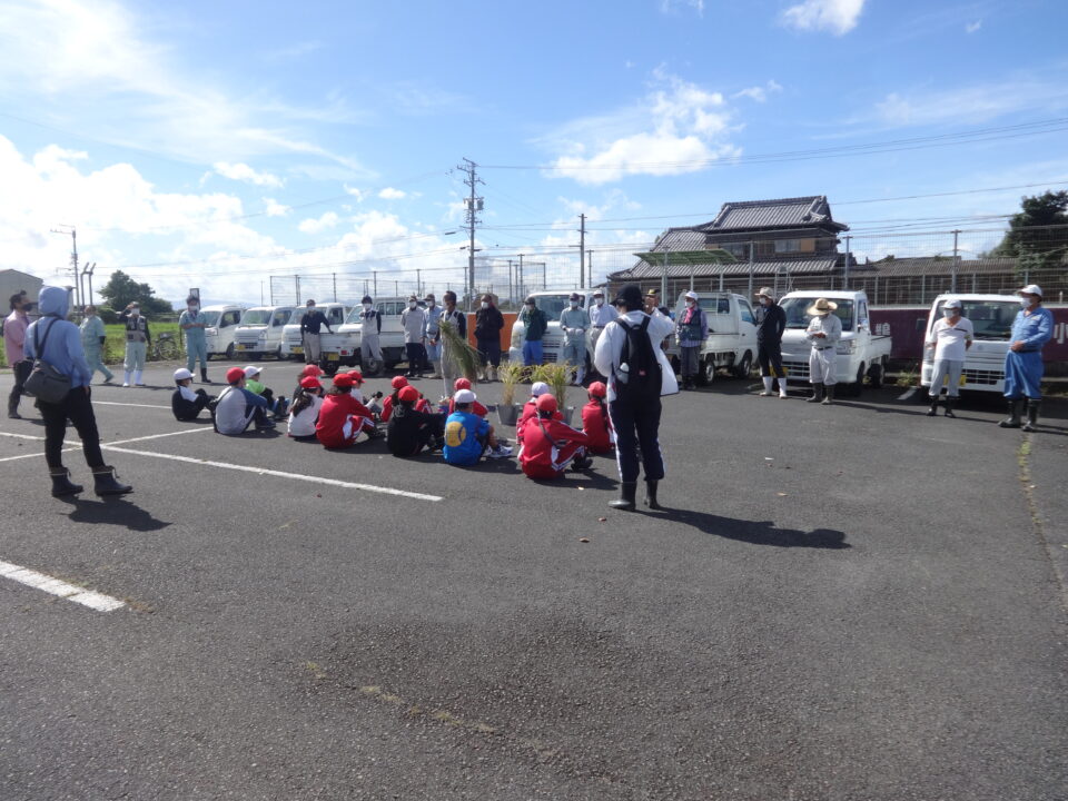 営農組合の方を中心に、環境保全協議会はじめ地域の20人程の方にお越しいただき、子どもたちへ稲刈りのご指導をいただきました。