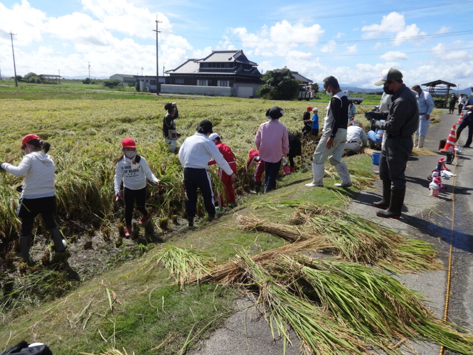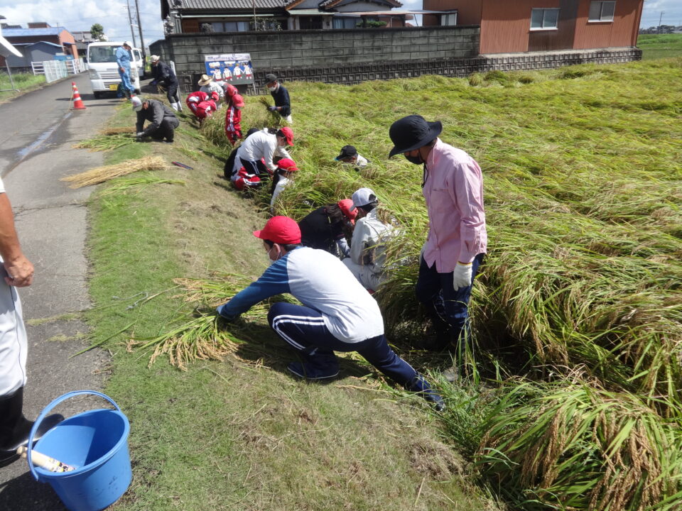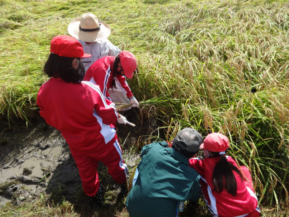 最初は「難しいな。」と言っていた子どもたちも、鎌の扱いに慣れてくると上手に稲刈りをすることができるようになりました。稲の生長を感じながら、地域の方々に一人ひとりご指導や声かけをいただき、子どもたちも意欲的に稲刈り体験に取り組むことができました。