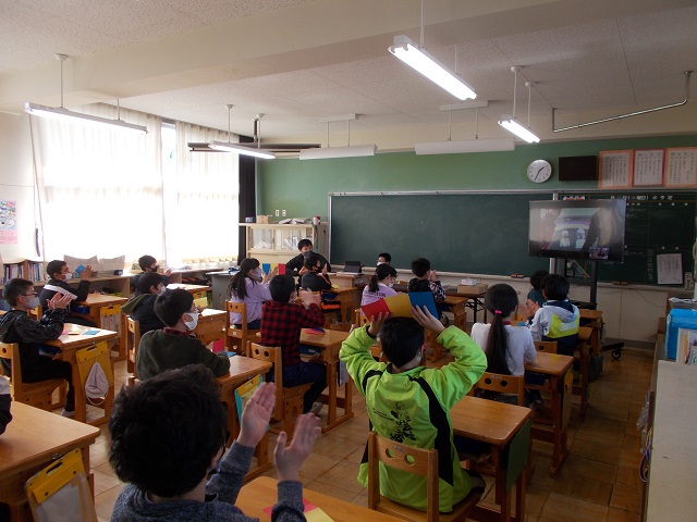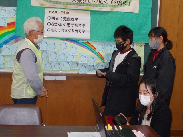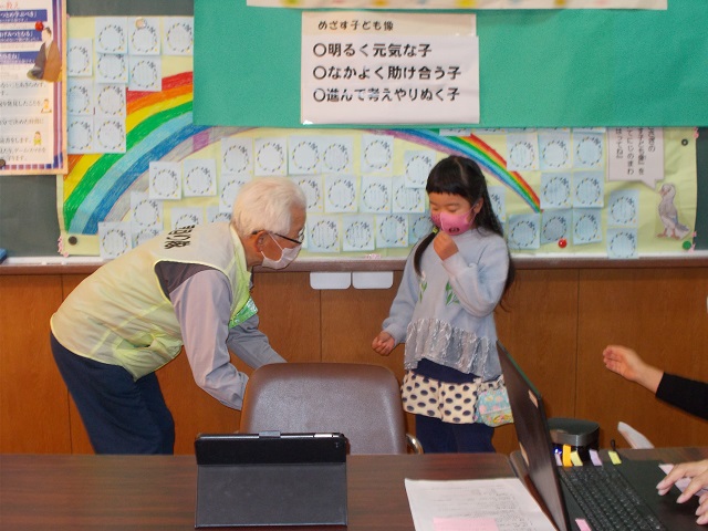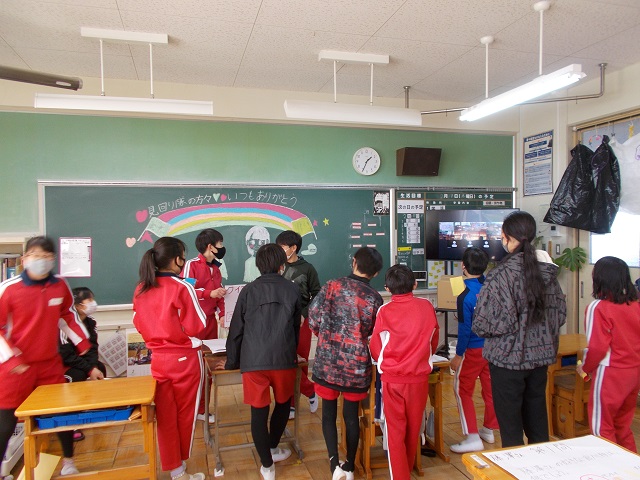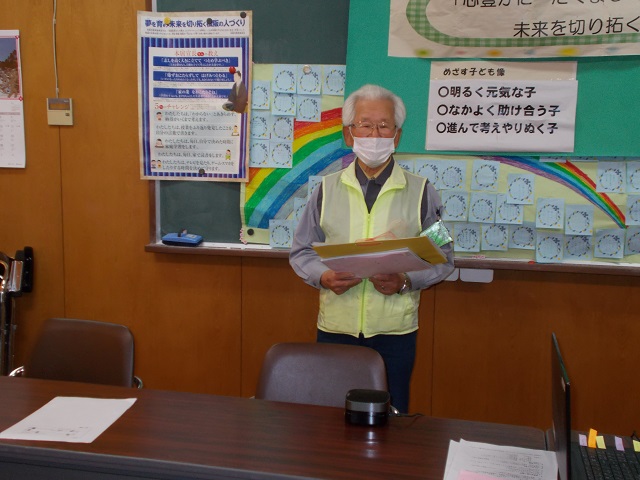 毎朝の通学や帰り道で大変お世話になっている見回り隊のみなさんに感謝の気持ちを表す集会を毎年行っているます。本年度はコロナの感染拡大を防ぐため、体育館にみんなが集まることを避けて、6年生が知恵を絞ってリモートで集会を行いました。各教室と会議室をオンラインで結んで、画面を通して見回り隊の方に関するクイズをしたり、日頃の感謝の気持ちを手紙にして代表が読んで、隊長に手渡したりました。最後に隊長から「毎日みなさんから元気をもらっています。元気に挨拶をしてもらうとますます元気をいただけます」と言葉をいただきました。今日は見回り会の方々全員には来ていただけませんでしたが、感謝の気持ちを日頃の挨拶などでお返ししていってほしいと思います。見回り隊のみなさん毎日ありがとうございます。これからもよろしくお願いいたします。