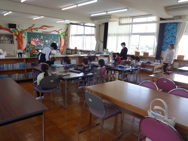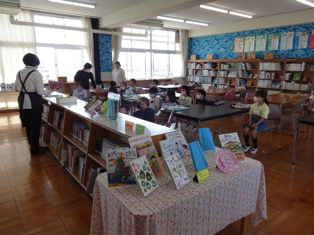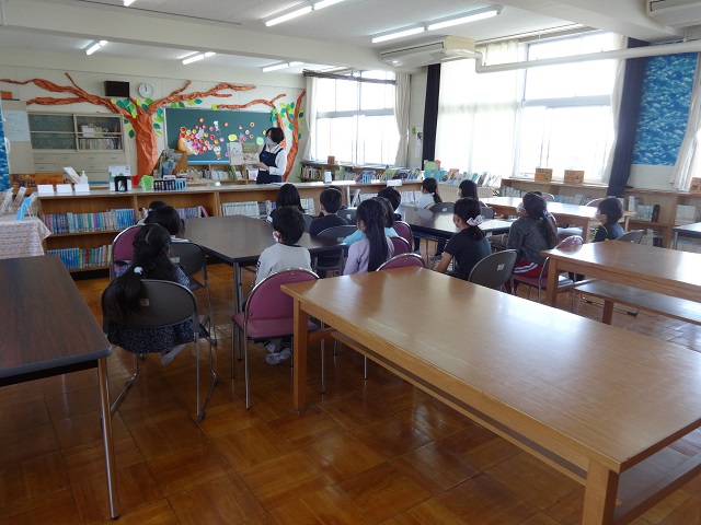 今日の4限目に2年生、5限目に1年生がTRC(図書館流通センター)の司書の方に来ていただいて、図書室の利用の仕方をお話していただいたり本や紙芝居の読み聞かせをしていただいたりしました。1年生も2年生もしっかりお話や読み聞かせを聞いていました。
