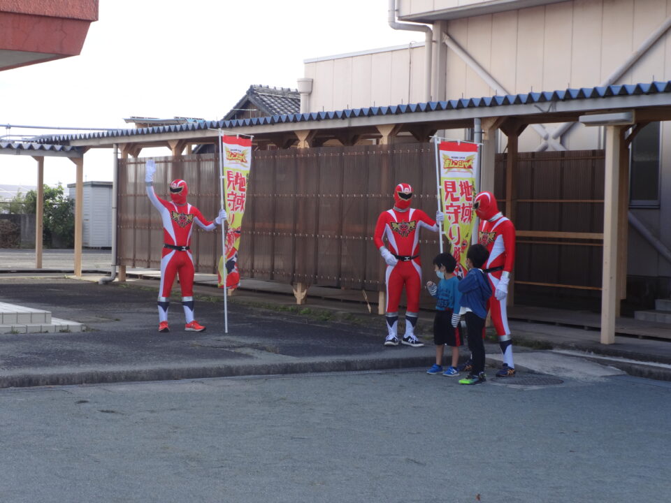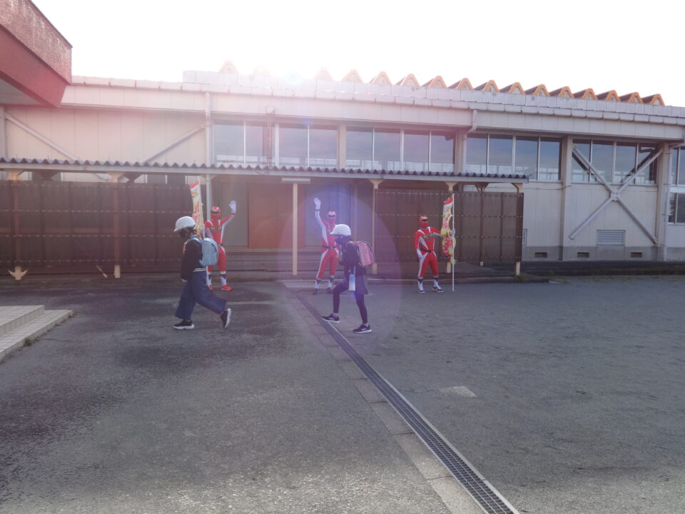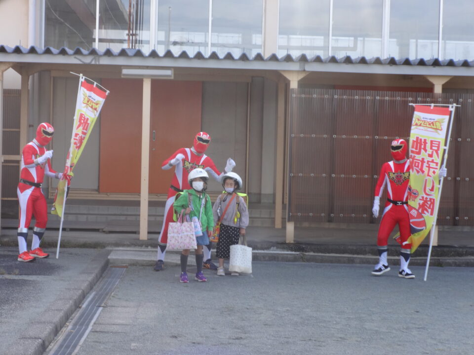 赤レンジャイのみなさんは、明るくあいさつをして子どもたちを元気づけてくれました。