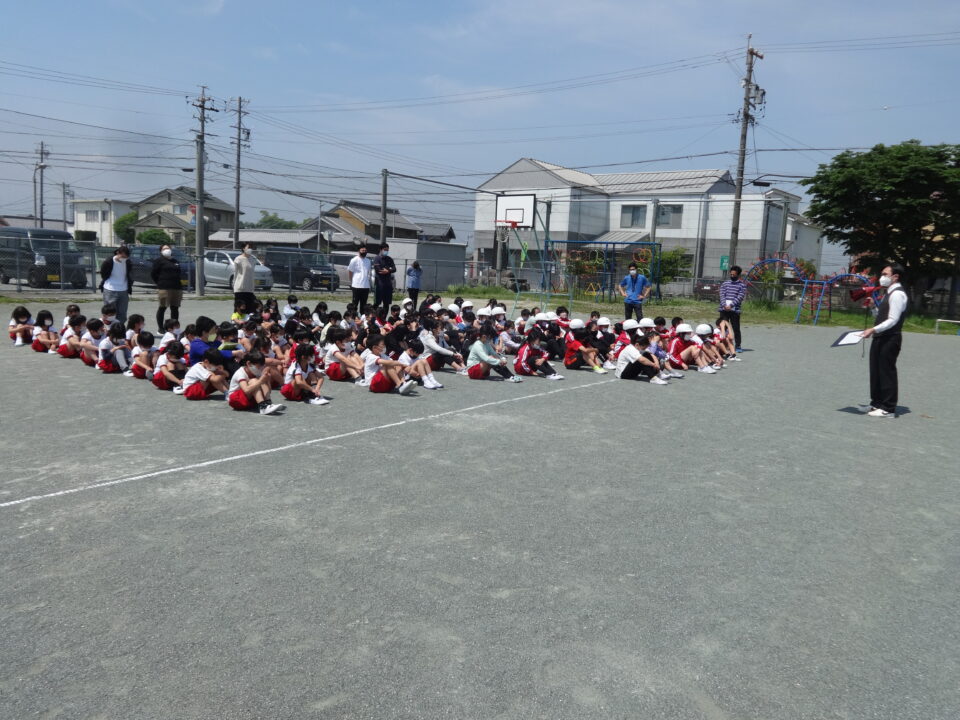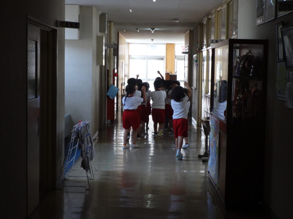 子どもたちは先生の指示、誘導に従って、早く避難することができました。避難にかかった時間は、2分25秒で、昨年度より18秒早く避難できました。