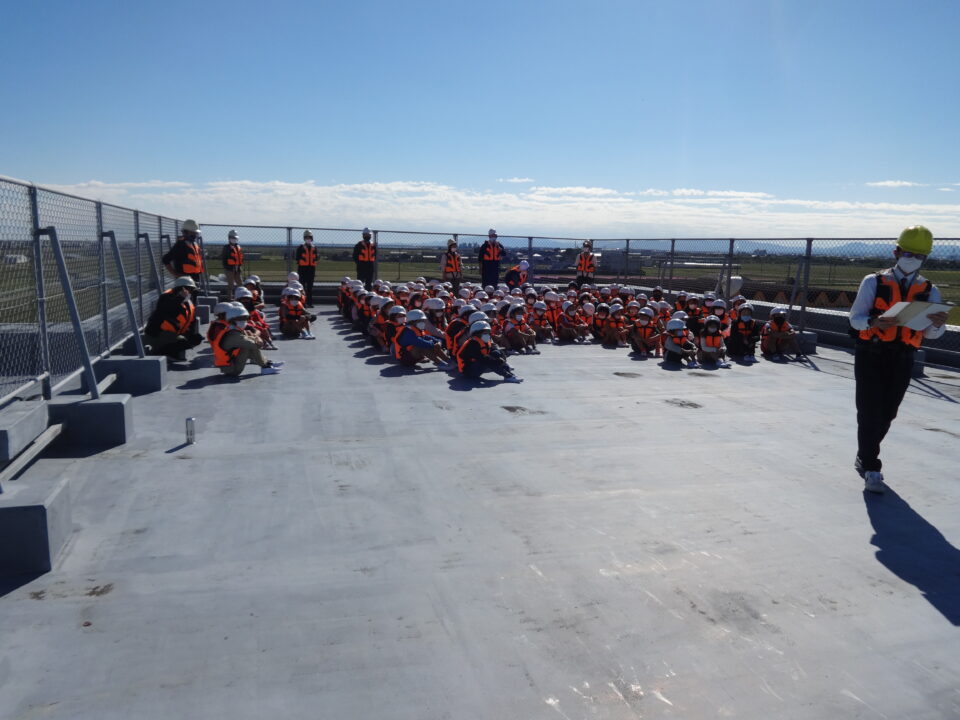 子どもたちは先生の指示、誘導に従って、ライフジャケットを着て、早く避難することができました。地震の想定では運動場へ1次避難をしました。その後、津波の想定では校舎屋上へ2次避難をしました。