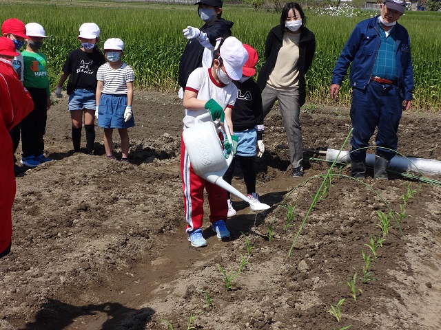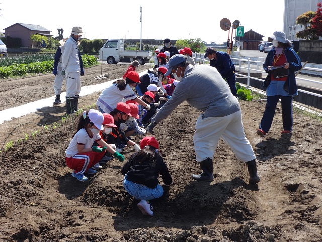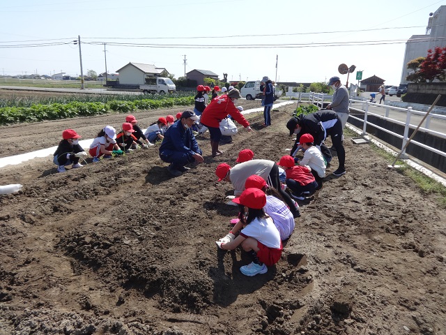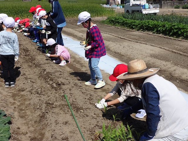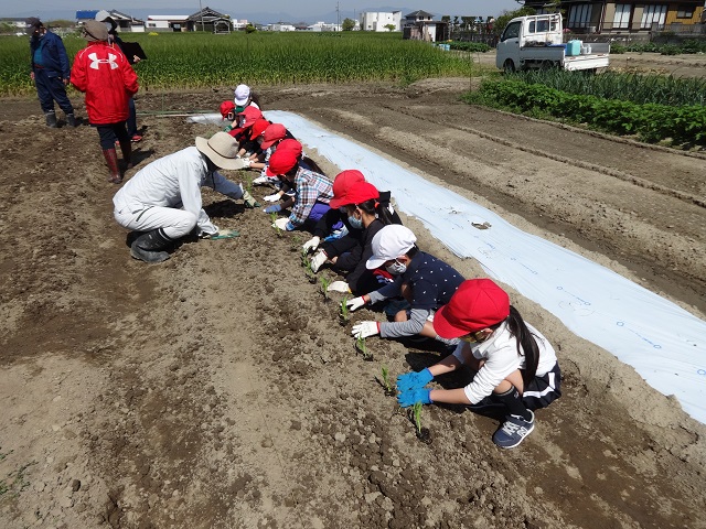 子どもたちは植え方を教えてもらいながら、楽しそうに一生懸命植えました。