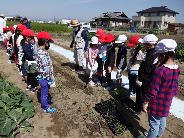 4月21日(水)の2限目、1・2年生が地域の笠松環境保全協議会の方にお世話になり、学校前の畑で「とうもろこし」の苗植えと大豆(枝豆)の種植えをしました。