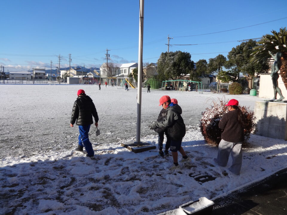 25日、今日の朝、子どもたちは運動場に積もった雪を見て、楽しそうに、嬉しそうに遊んでいました。雪を集めて、小さな雪だるまを作っている子もいました。