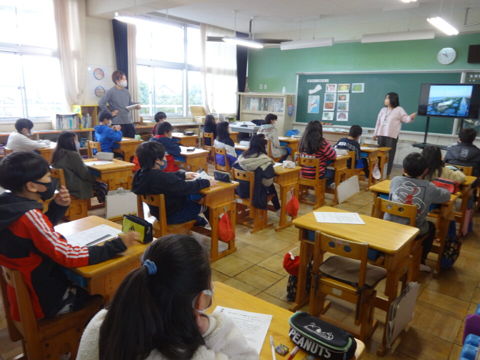 先生からの課題で「松阪市で作られている、食べ物にはどんなものかありますか?」に対して、子どもたちは松阪牛、ブロッコリー、いちご、なばな、嬉野だいこん、トマト、モロヘイヤ、きくらげ、あおさ、卵、緑茶、松阪あかな、米と元気よく発表できました。