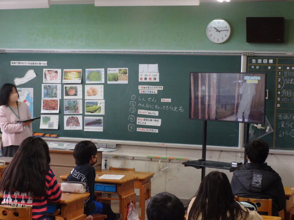 学習のめあては「給食に使われている松阪市の食べ物を知ろう」です。