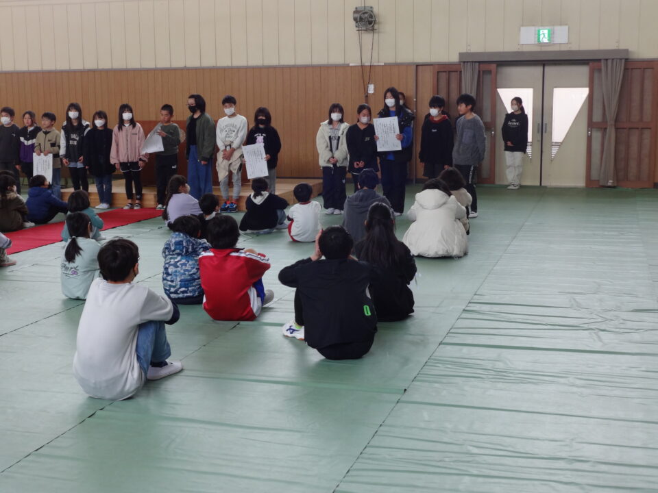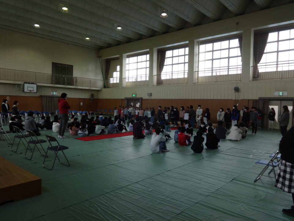最初に後期の児童会役員が最後ということで、全校児童にあいさつを一人ひとりしました。児童会役員の活動をすることによって、新たな成長があったことを伝えていました。これまで、がんばってくれてありがとうございました。