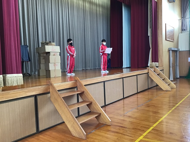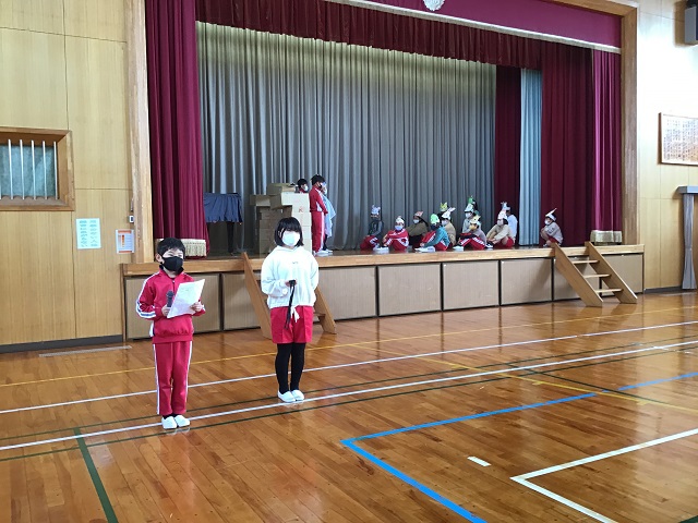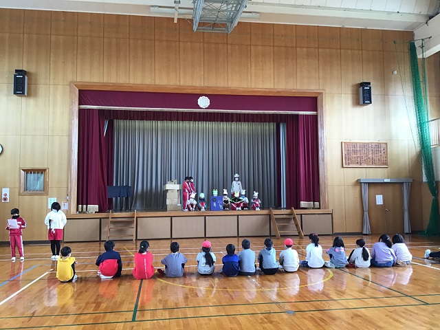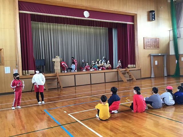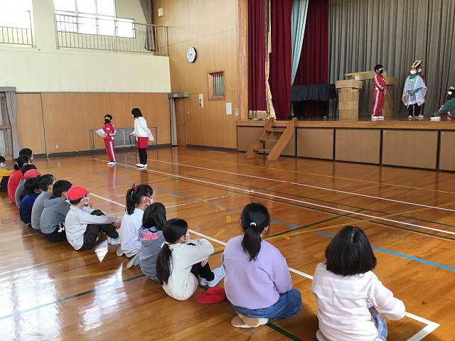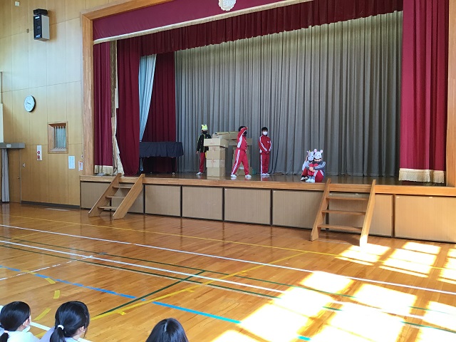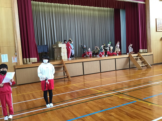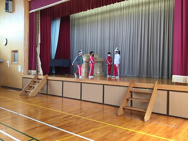 4年生は毎年校区にある第二吉祥苑さんに交流に行かせてもらっています。今までそこで劇などを披露してきたのですが、今年はコロナのため交流が中止となっていました。しかし4年生は劇だけでも演じたいと、学校の体育館で観客を3年生だけとして上演しました。内容は十二支のお話しを題材として、神様がコロナウィルスに感染して、動物たちが薬を届けるというオリジナルなものでした。4年生はそれぞれがきちんと役割を果たしていて、クラスがまとまっている感じがしました。長いセリフの子もいましたが、大きな声で発声できていました。第二吉祥苑で演じられなかったのは残念でしたが、3年生からもよい感想を言ってもらって、自信を深めている様子でした。