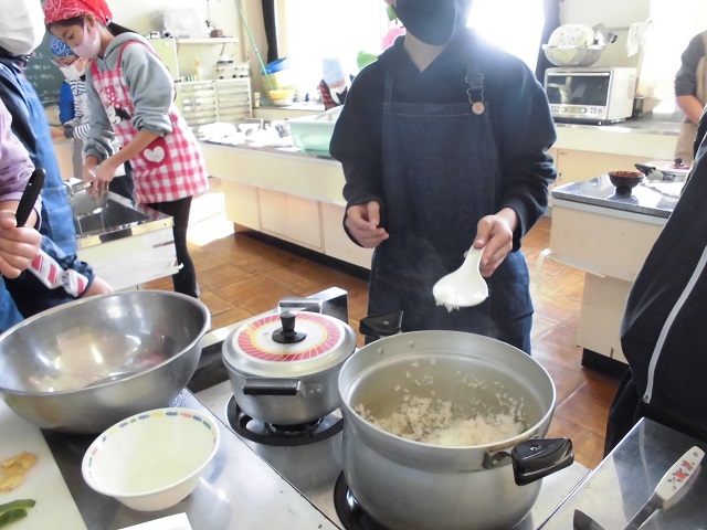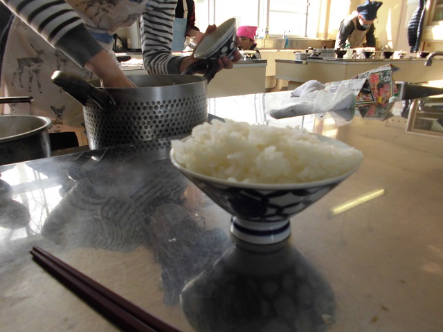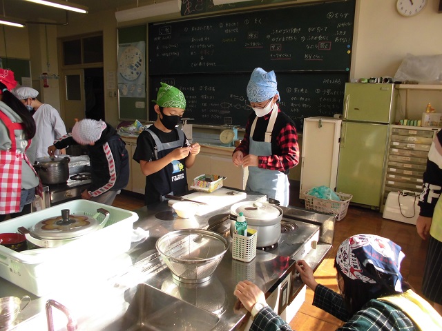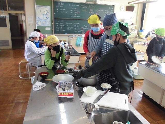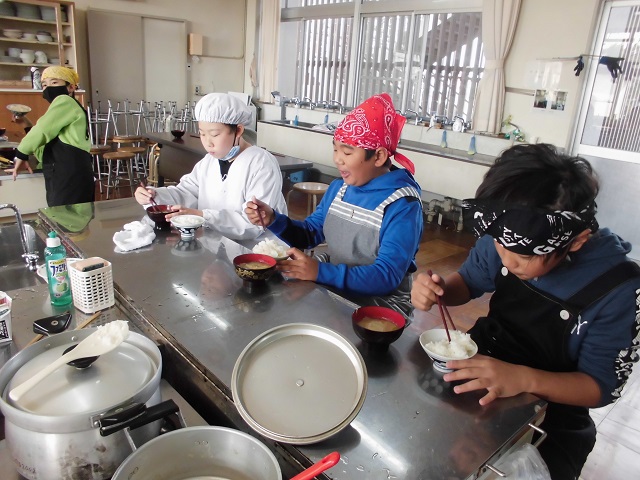 5年生は調理実習を行いました。炊飯器ではなく鍋でご飯を炊きました。味噌汁は煮干しでだしをとったのでとても味わい深いできとなりました。いちょう切りした大根は先日1,2年生が収穫したものです。自分達が収穫した米を使って行った調理実習。その味は格別であったようです。ぜひ家庭でも味噌汁つくりにチャレンジしてみてはどうでしょう。