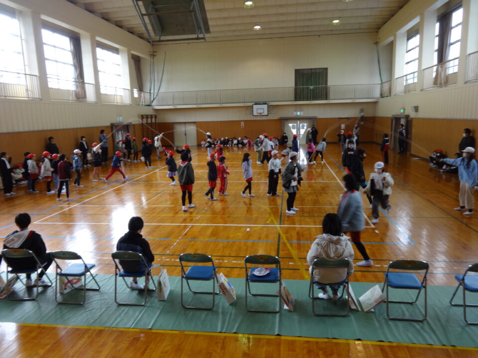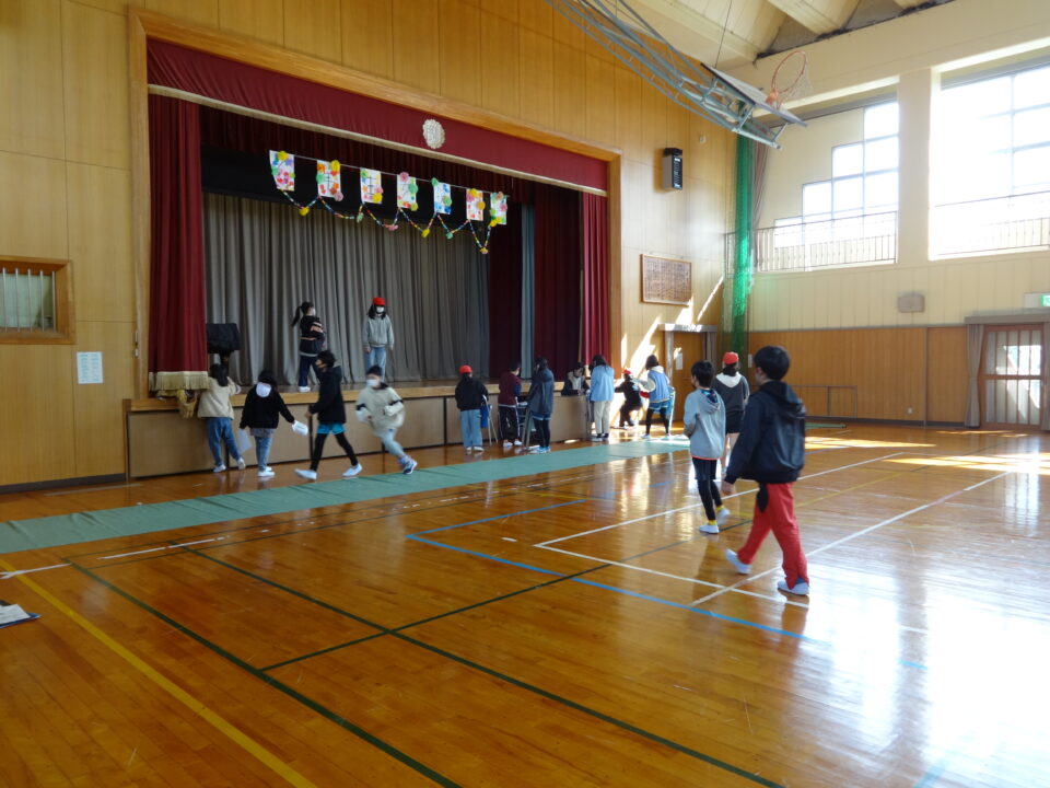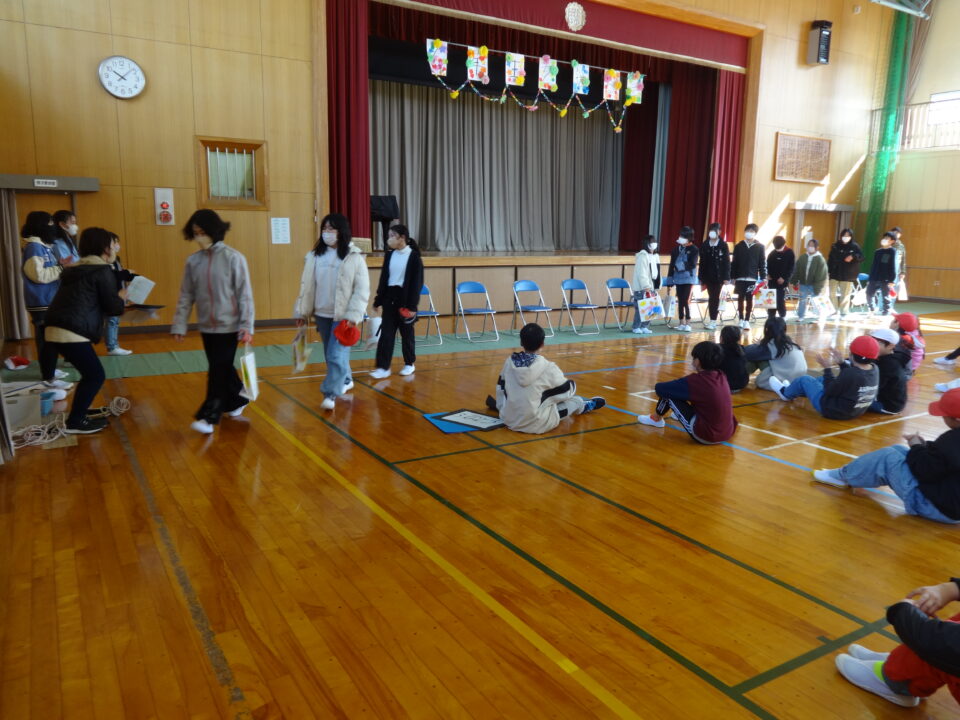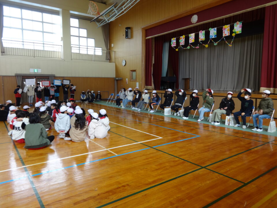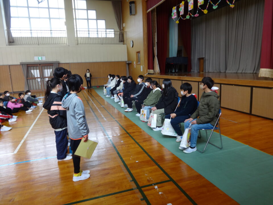 6年生を送る会では、校長先生のお話の後、お世話になった6年生に、各学年が感謝の言葉を伝えて、プレゼントを渡しました。1年生から5年生まで感謝の気持ちを伝えることができました。6年生のみなさんも嬉しそうでした。その後、5年生が計画した、3択クイズと長なわとびをしました。3択クイズでは盛り上がっていました。長なわとびの回数では、100回以上跳べたチームもありました。6年生からは「楽しかった。」と声が出ていました。最後に、6年生からのお返しとして、掃除道具や書道バケツなど学校中のバケツをきれいに掃除したことを全校に伝えました。