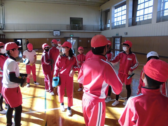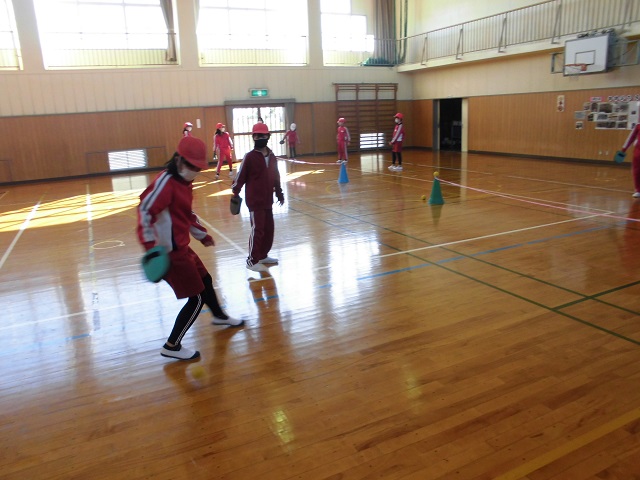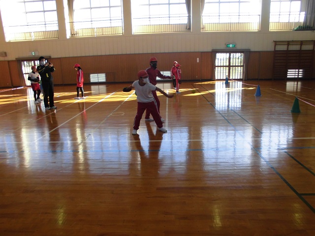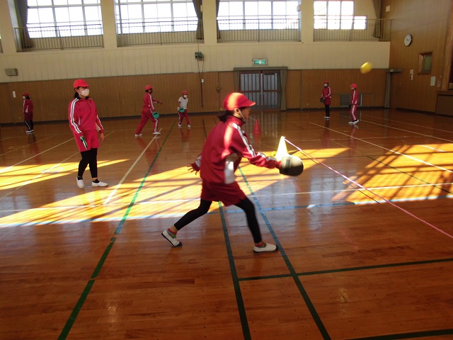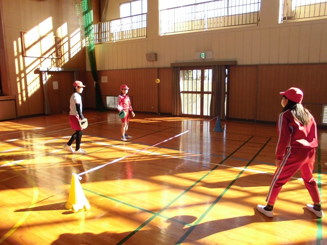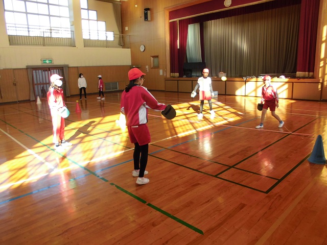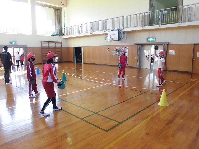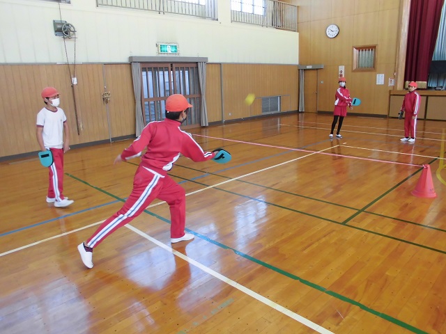 6年生は体育の時間にテニピンという競技を行っています。スポンジのボールを手にはめたグローブのようなラケットでテニスのように打ち合う競技です。子ども達は慣れるまでは難しそうにしていましたが、次第に上手に打ち合えるようになってきました。ペアでゲームができるようにまで上達した子もいました。体育館は風の影響も少なく、適度な広さで担任手作りの簡易ネットをはさんで楽しそうに競技をしていました。